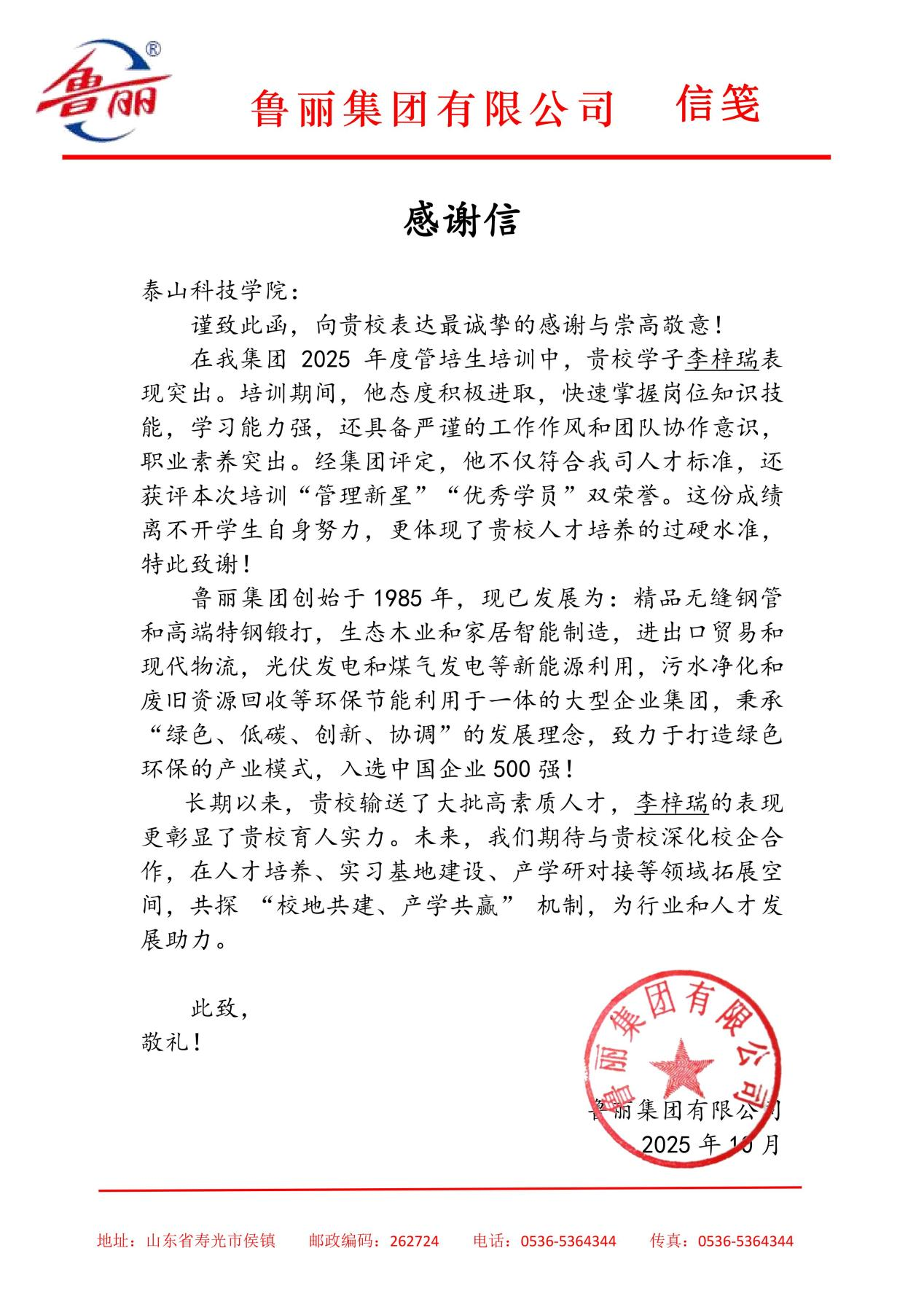 10月10日,我校收到一封来自鲁丽集团有限公司的感谢信,信中对我校2025届毕业生李梓瑞同学在集团管培生培训中的突出表现给予高度评价。这封感谢信不仅是对学生个人能力的认可,更是对我校“四位一体双院制”高质量人才培养模式的有力肯定。