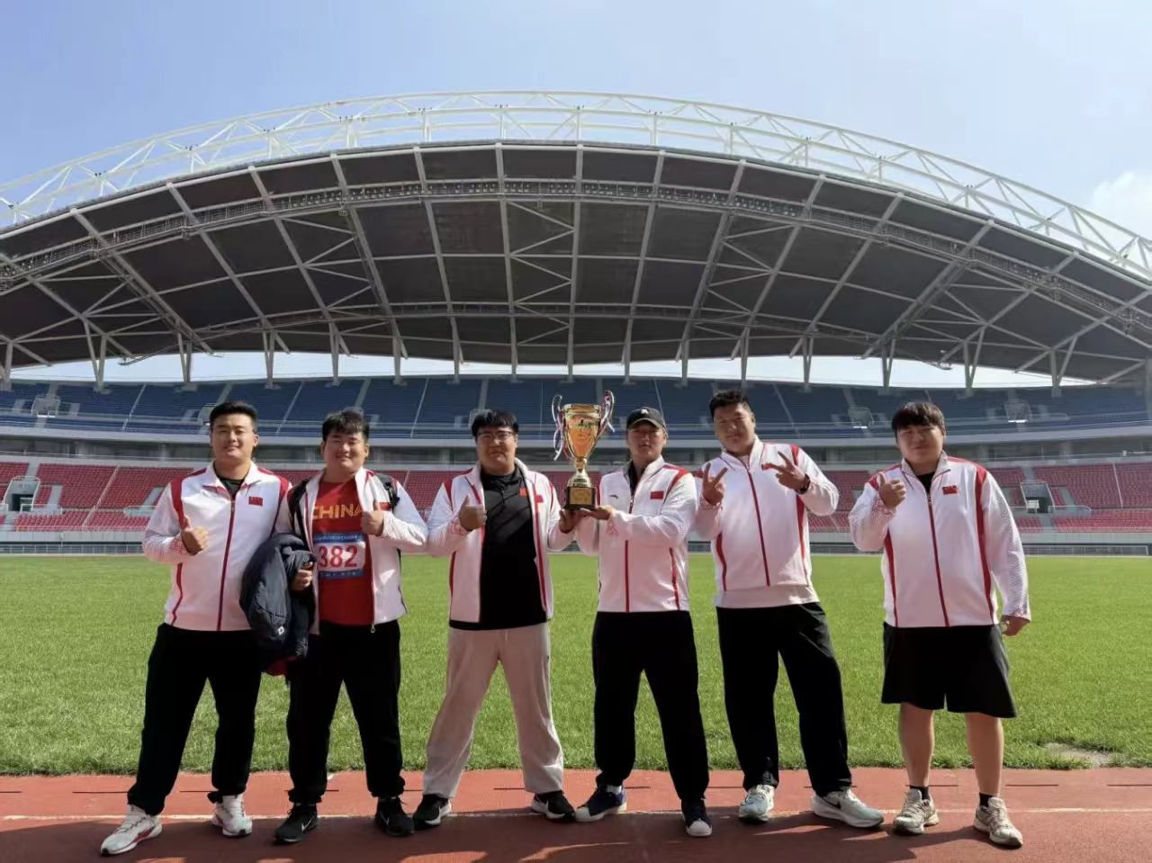 (泰山科技学院田径队赛场获奖集体照)