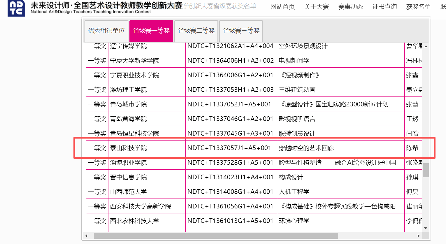 为持续推进学校“教育教学三提三创”主题年活动,统筹做好一流课程建设,近日,我校蓬莱科幻学院(云端剧本杀学院)教师陈希在未来设计师·全国艺术设计教师教学创新大赛(NDTC)省赛中荣获一等奖,泰山科技学院荣获大赛优秀组织单位奖。