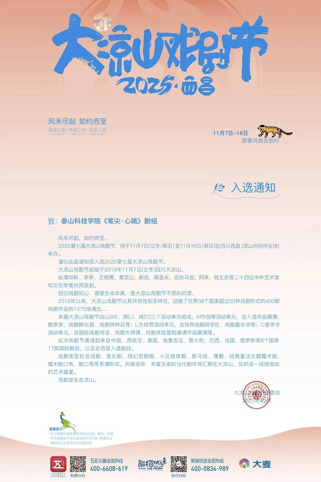 参加第七届大凉山国际戏剧节,是泰山科技学院“完满教育”发展历程中的一座里程碑,更是一个全新的起点。《笔尖·心跳》将以笔尖为媒介,以心跳为节奏,在大凉山的戏剧舞台上与全球观众展开关于爱与表达的多元对话,为这场“温暖之期、神奇之地、戏剧之旅”注入属于泰科的青春活力。我们坚信,在“完满教育”理念的持续引领下,未来将有更多泰科学子站上更广阔的舞台,书写属于自己的灿烂篇章。