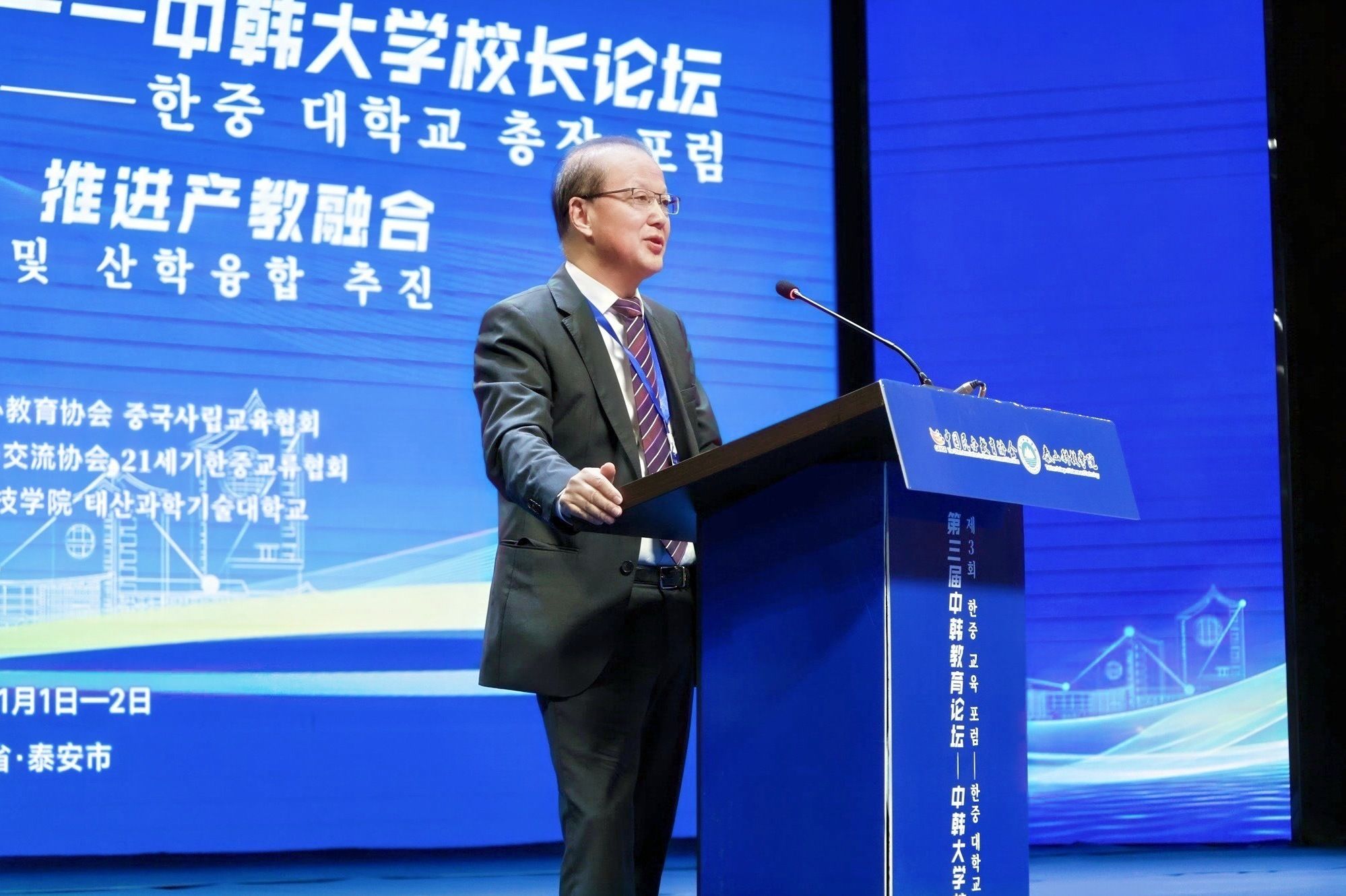 10月31日至11月1日,在教育部指导下,由中国民办教育协会主办、21 世纪韩中交流协会协办、泰山科技学院承办的第三届中韩教育论坛—中韩大学校长论坛在山东泰安成功举办。本届论坛吸引了来自中韩两国近百所高校参会,围绕“加强国际合作,推进产教融合”主题,就高校人才培养创新、校企协同发展、区域教育合作等核心议题展开深度交流,在师生双向交流、专业共建、科研合作等方面探讨合作机制。论坛由开幕式、主旨报告、中韩高校产教融合创新实践交流会、合作洽谈会等环节组成。