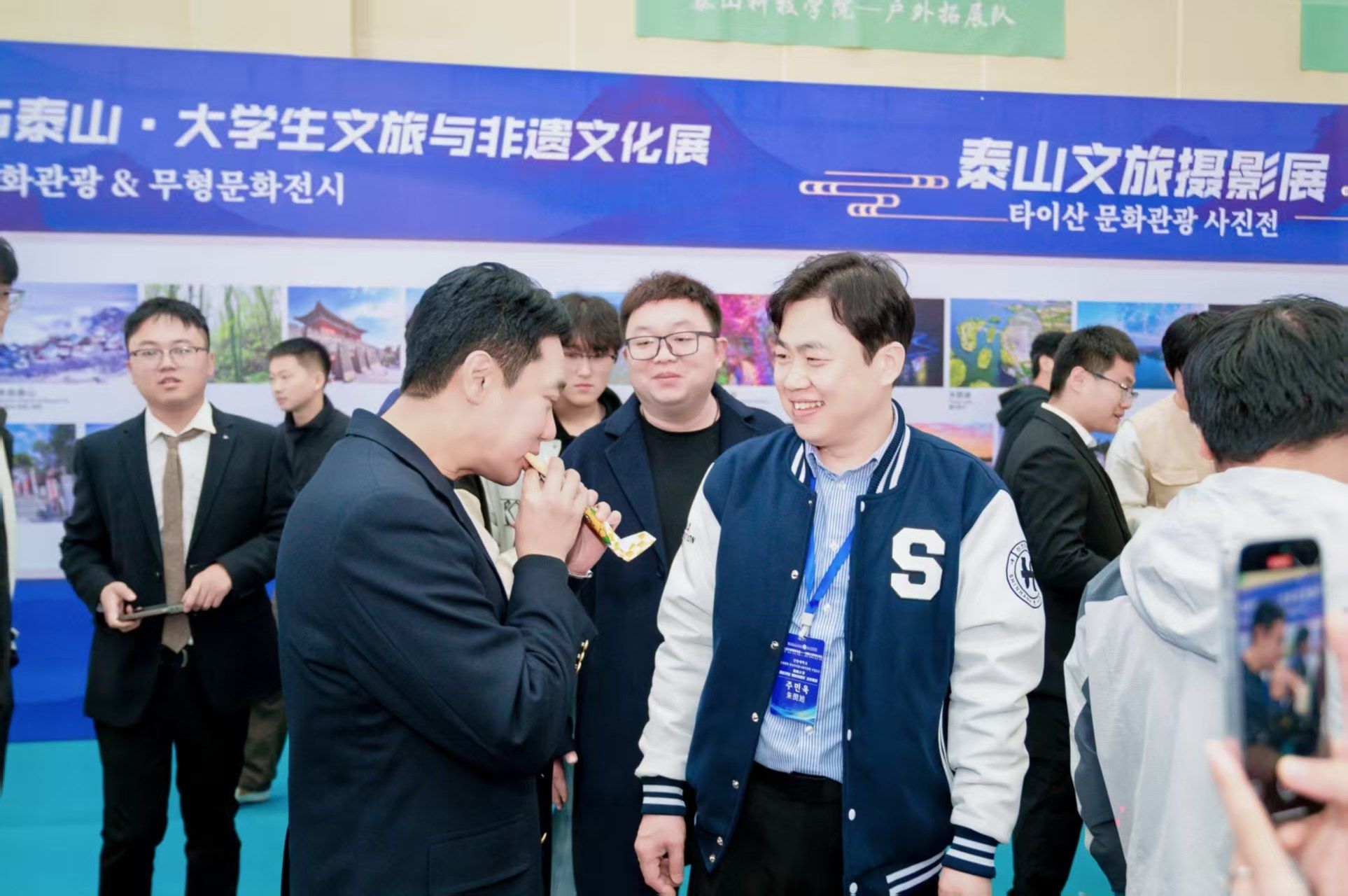 “2025泰山·大学生文旅与非遗文化展”成为互动热点。嘉宾们体验泰山煎饼制作、组装榫卯模型,与非遗传承人零距离交流,亲身感受泰山文化的魅力。信韩大学国际学院护理保健学主任教授崔明植表示:“今天能来到中国,参与这场意义深远的交流活动,我特别有感触,感觉中韩紧密相连宛如一体。”