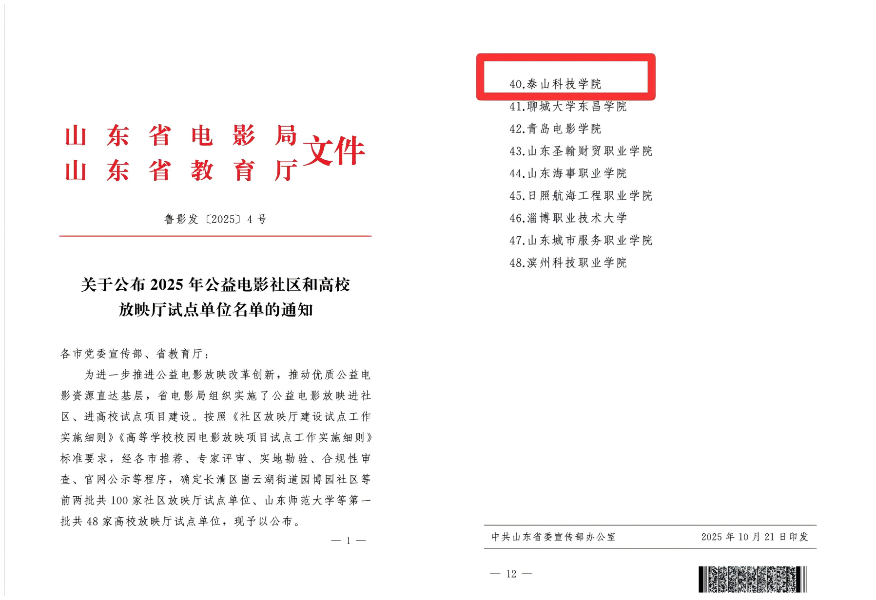 近日,山东省电影局与山东省教育厅联合印发《关于公布2025年公益电影社区和高校放映厅试点单位名单的通知》(鲁影发〔2025〕4号),我校凭借扎实的硬件基础、完善的组织保障和鲜明的育人导向,成功获批首批山东省高校放映厅试点单位。