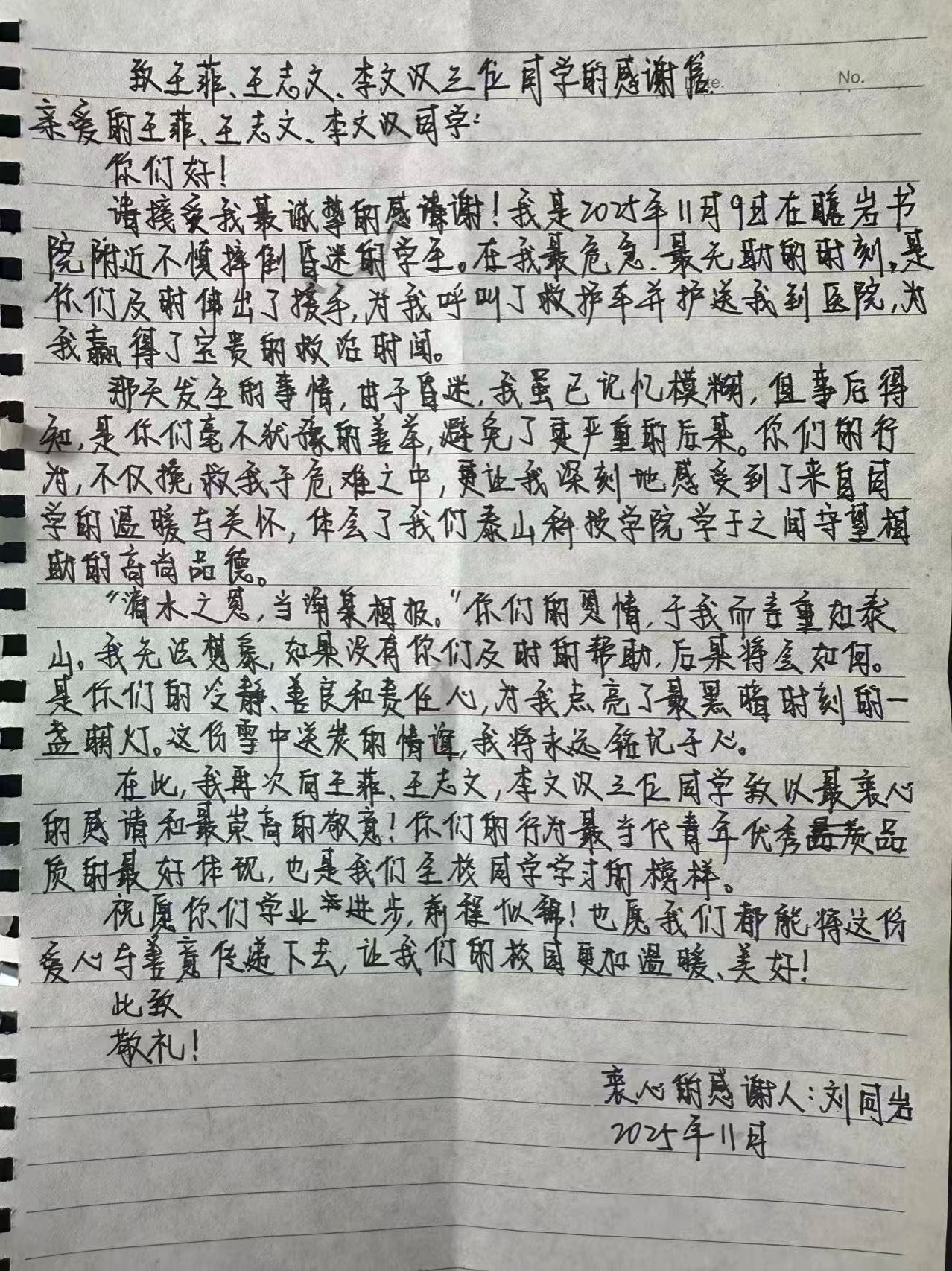 让人欣慰的是,刘某被送医后不久便逐渐清醒,虽然对事发经过记忆模糊,但始终记得是几位同学的及时相助让自己脱离了危险。康复后,他特意加上好友,给三人发了微信:“你们的恩情,于我而言重如泰山。我无法想象,如果没有你们及时的帮助,后果将会如何。是你们的冷静、善良和责任心,为我点亮了最黑暗时刻的一盏明灯。这份雪中送炭的情谊,我将永远铭记于心。”