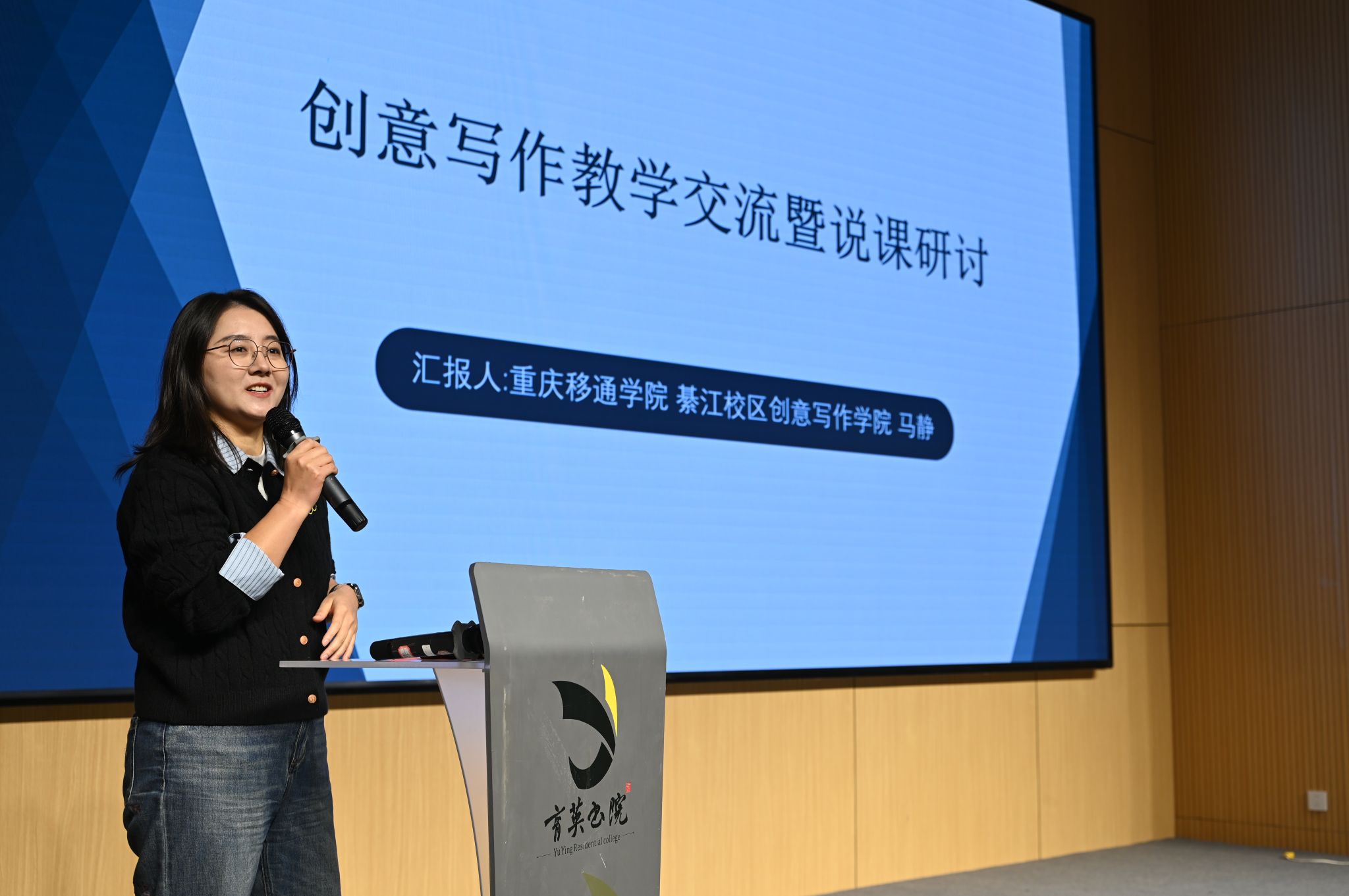 重庆移通学院(綦江校区)马静介绍了《创意写作》以互动教学为核心,采用游戏化方式激发学生创作热情,通过剧本杀、荒岛求生等情境设计训练故事合理性、人物塑造与矛盾构建;运用音乐联想促进形象思维转化;结合AI工具进行创作对比实验,引导学生认识其辅助价值与文学创作边界。
