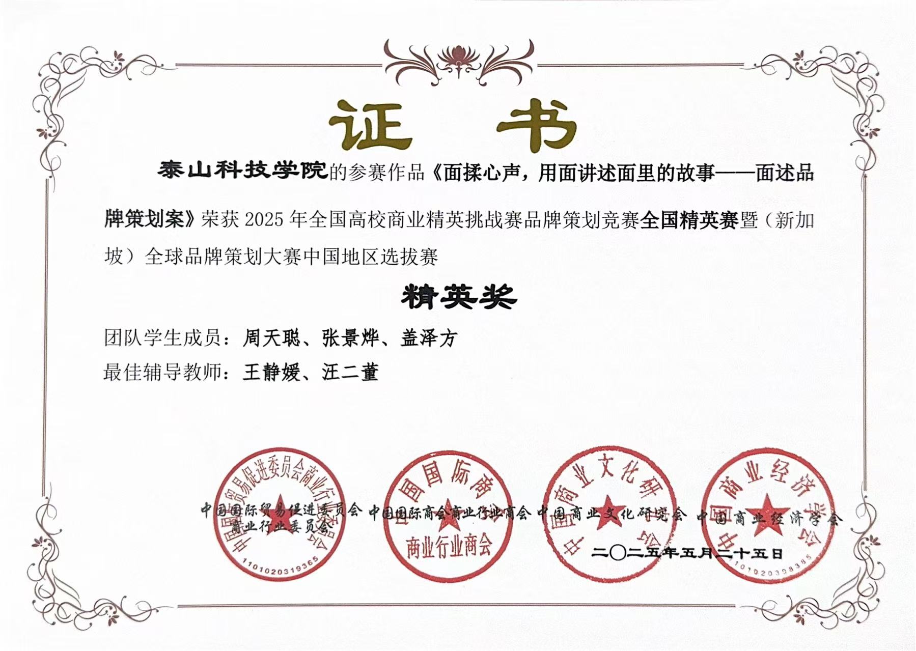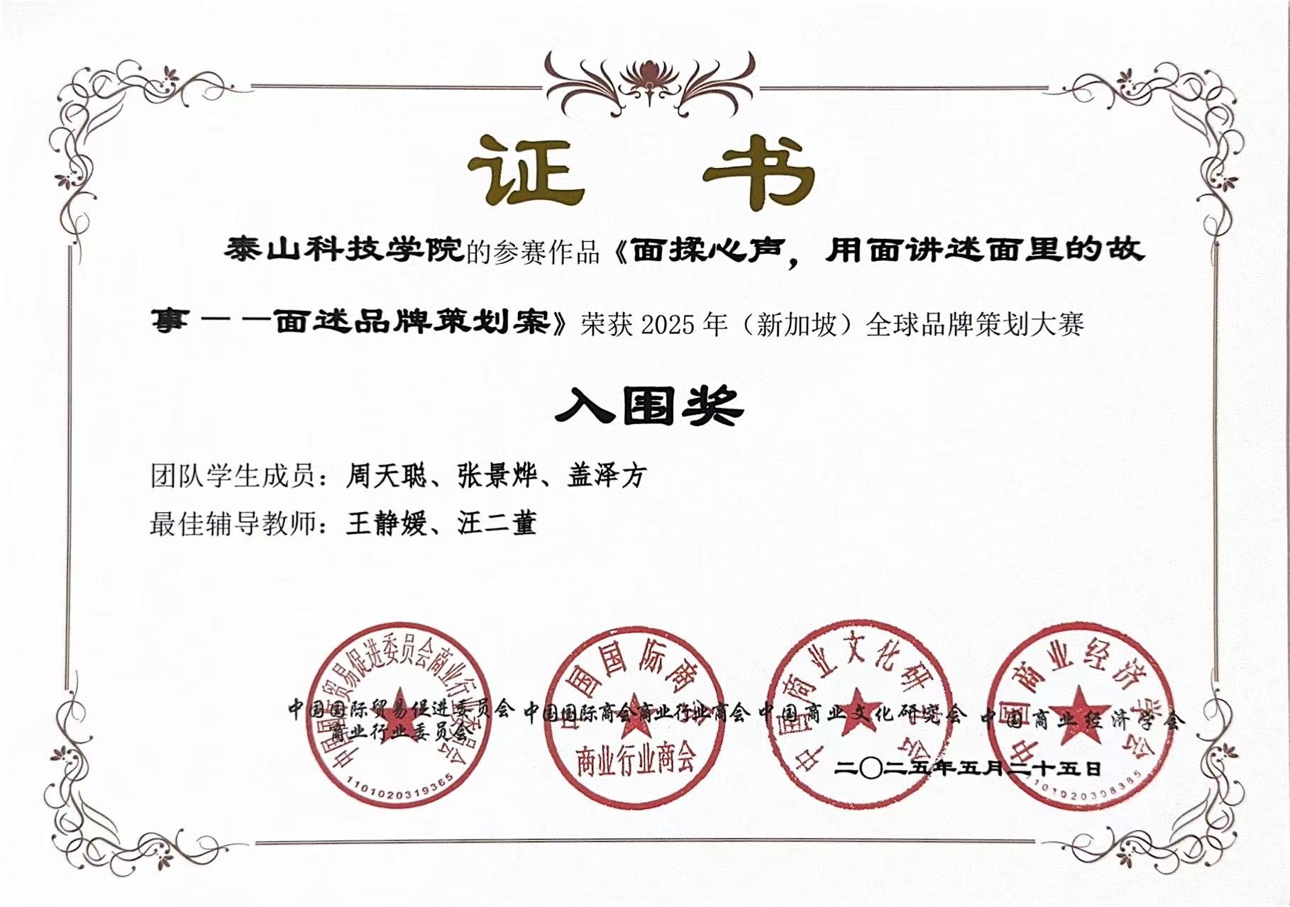 在各类赛事中,学子们屡获佳绩,斩获“2025年全国高校商业精英挑战赛品牌策划竞赛全国精英奖”“最佳展示奖”、泰安市精品旅游文创设计大赛二等奖3项、2025“东方美学”艺术设计大赛一、二等奖等多项荣誉,展现了青年一代的非遗传承实力与创新能力。