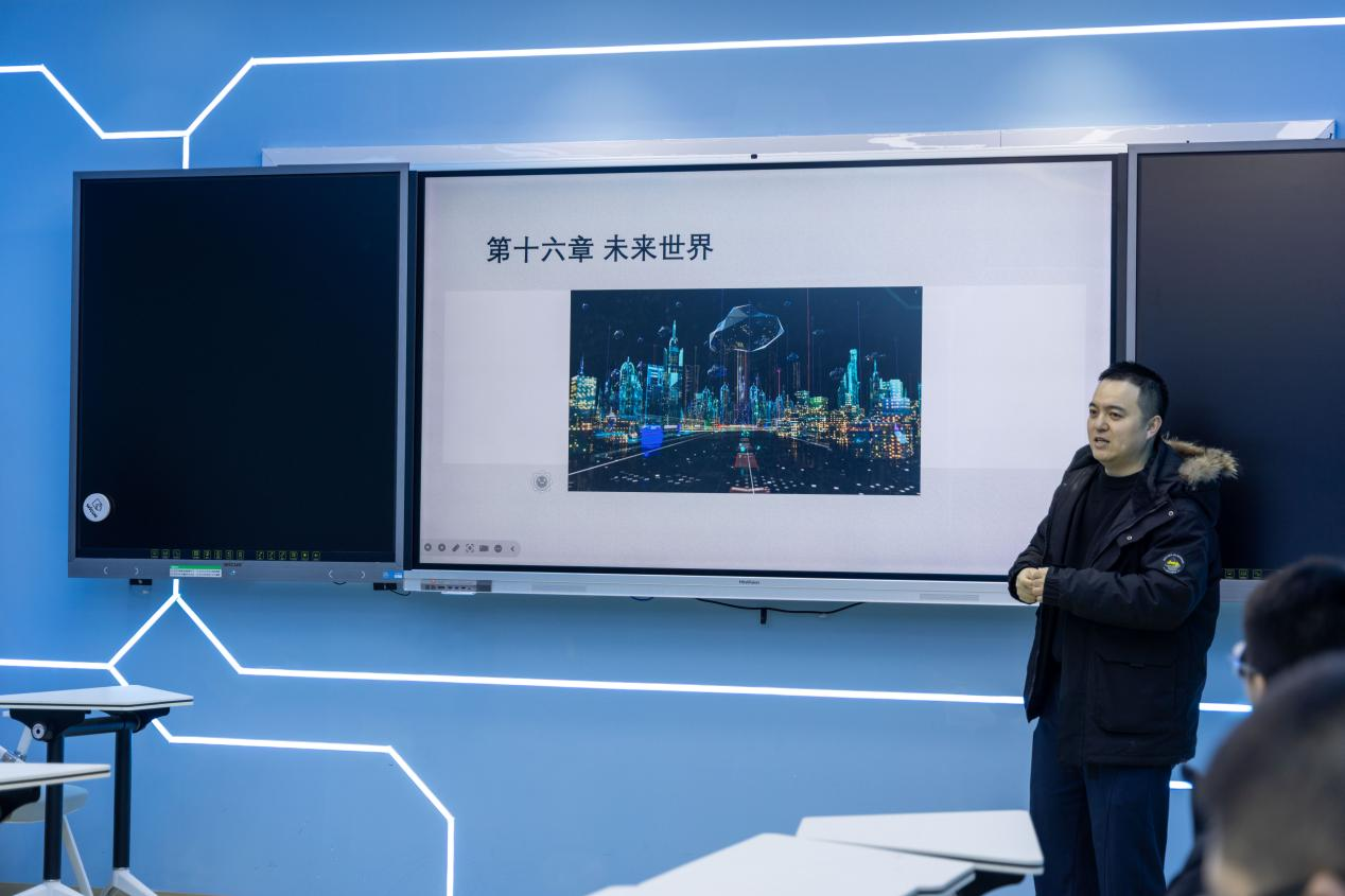 在无用楼303的“42号宇宙”未来教室,刘大响院士现场观摩了蓬莱科幻学院教师薛瀛主讲的科幻与多媒体融合示范课。课程以“科幻与想象力:未来世界”为主题,通过“PPT+动画+视频+解说”的多模态教学手段,创造性融合经典科幻文本与当代视听语言,进行了一场沉浸式跨媒介叙事实践。薛老师从《桃花源记》的田园理想,《乌托邦》的社会构想,延伸至《大机器停止运转》对科技异化的反思,并通过对《疯狂的麦克斯》《未来水世界》等影片的拉片分析,引导学生解码视觉符号、场景建构与叙事逻辑,深入探讨科幻作品如何承载现实关切、技术想象与人文思考。