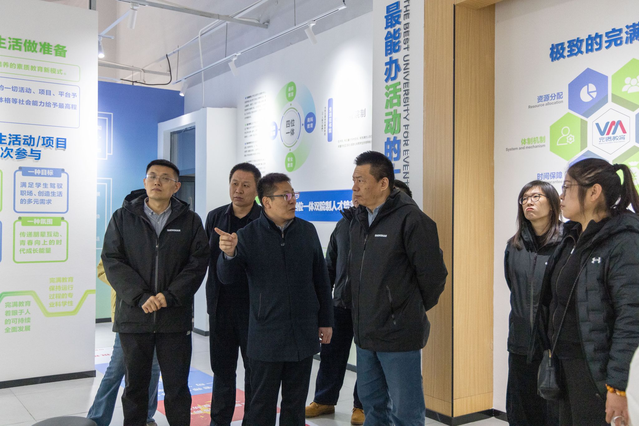 考察团一行实地走访了岳动馆、万画影城、敢当书院、“一站式”学生服务大厅及双体软件精英产业学院等育人场所,直观感受泰山科技学院“以学生为中心”的办学实践。在万画影城,师生原创影片《风拂育英》展示了学校“以文化人、以美育人”的实践成果;在敢当书院,考察团重点了解了以社团活动、志愿服务、竞技体育、艺术实践为核心的“完满教育”体系,以及书院在跨学科陪伴、师生互动等方面的创新举措。