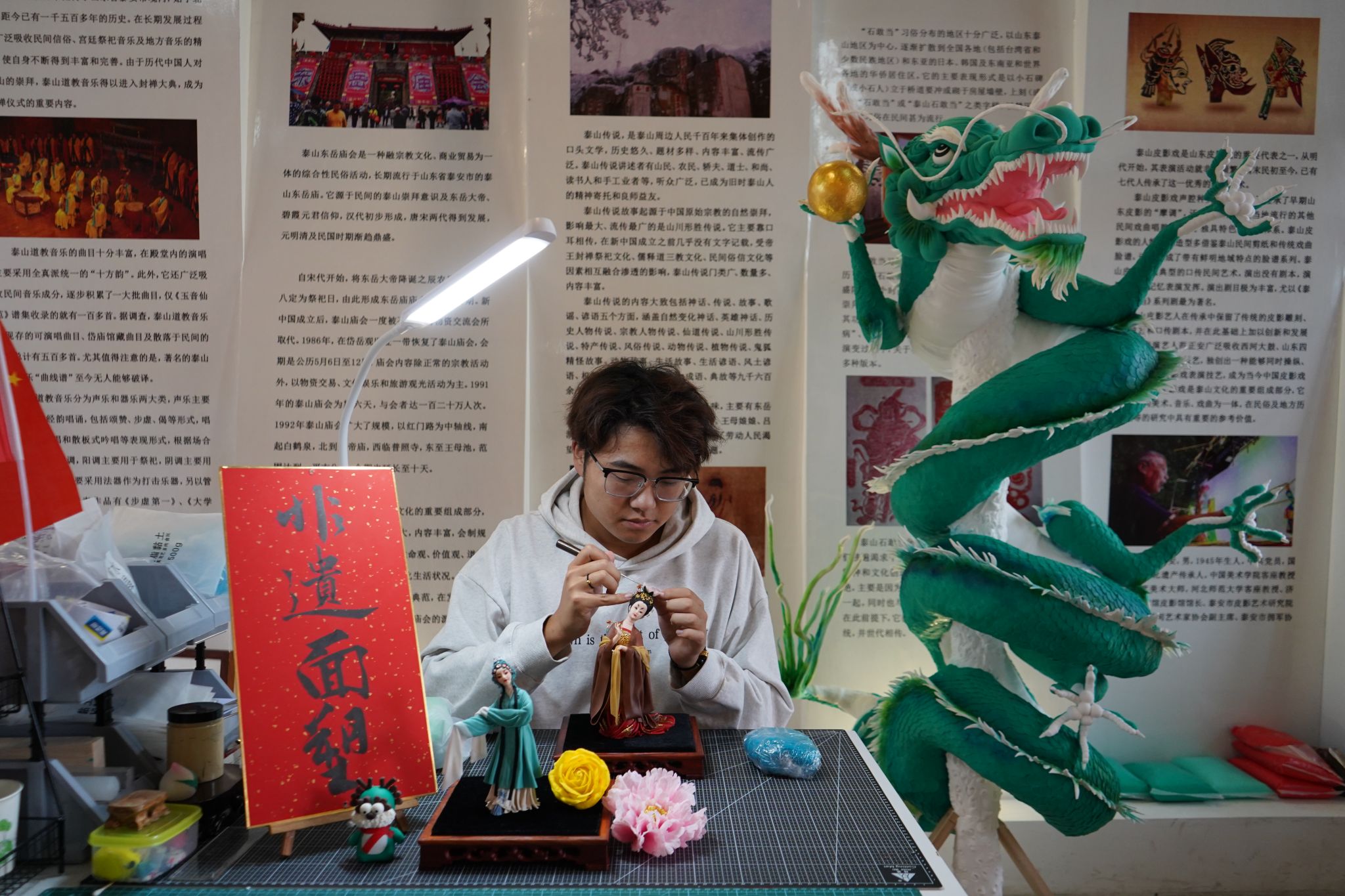 近年来,泰山科技学院非物质文化遗产研究中心依托山东省非物质文化遗产研究基地、泰安市非物质文化遗产传承教育实践基地等平台,深耕“校园手艺人”育人模式,构建起“一馆一厅九工坊”的立体传习空间,通过工坊实践、导师制培养、项目制学习等方式,为学生提供沉浸式非遗研习环境。周天聪作为学校非遗传习社社长、面塑工坊主理人,正是这一模式的杰出代表。