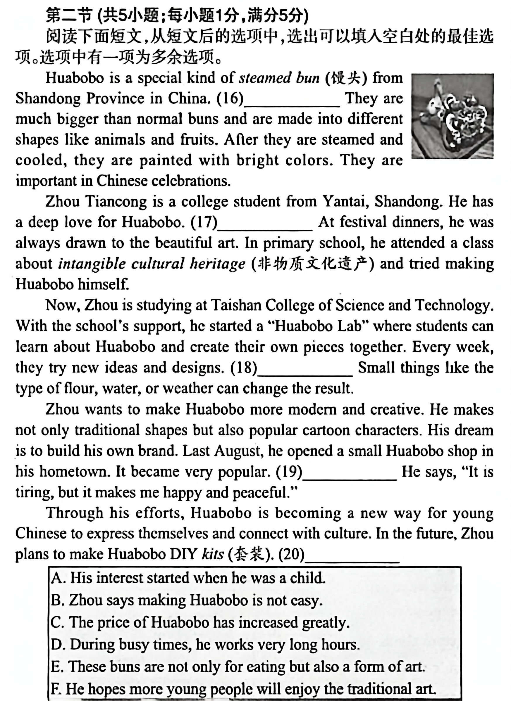 近日,一份面向全国初、高中生的《学英语》报纸引发广泛关注。2025-2026学年九年级第22期试卷中,一道“6选5”阅读理解题的主人公并非传统名人大家,而是一位正在创业路上的“00后”年轻人——胶东花饽饽手艺人、泰山科技学院应届毕业生周天聪。