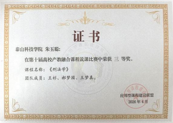 同期举行的教师说课比赛中,泰山科技学院行政管理学院教师朱玉聪代表《刑法学》课程教学团队参赛。她从课程定位、设计、实施、评价、创新五大维度进行了说课展示,针对传统法学课程理论与实务脱节、校企协同流于形式等痛点,创新提出“教-学-练-战-评”一体化教学模式。经过激烈角逐,朱玉聪老师最终荣获赛事三等奖。