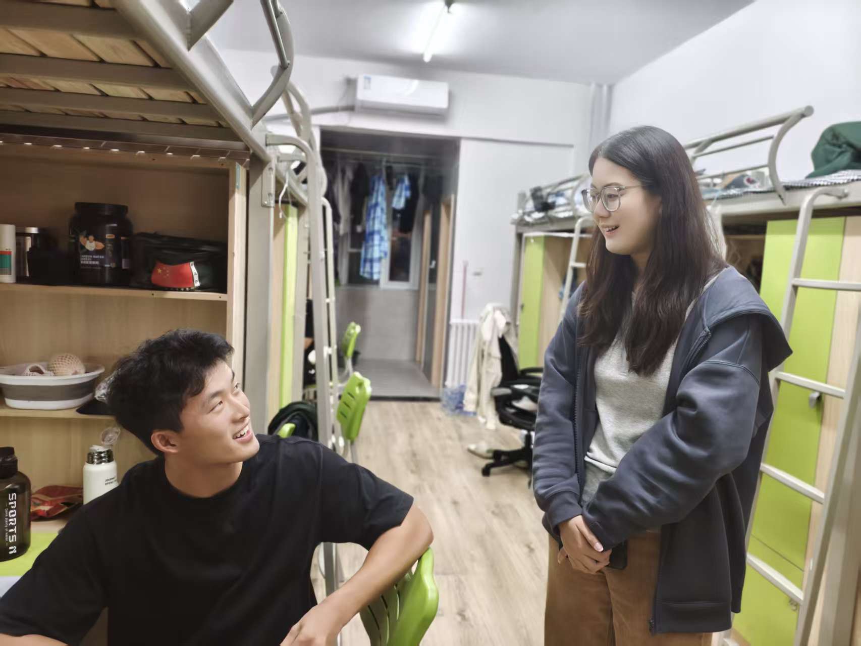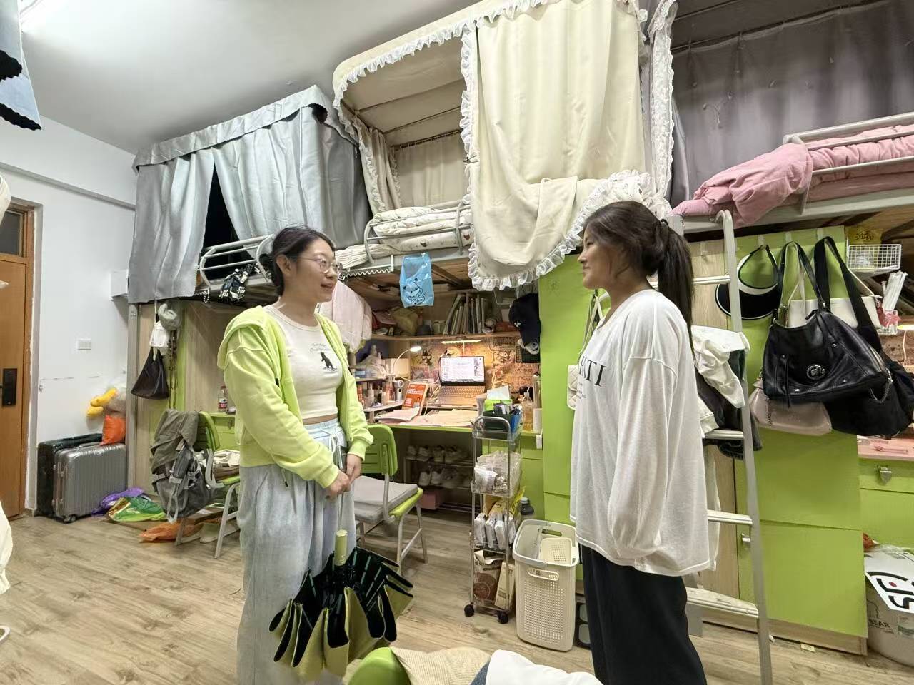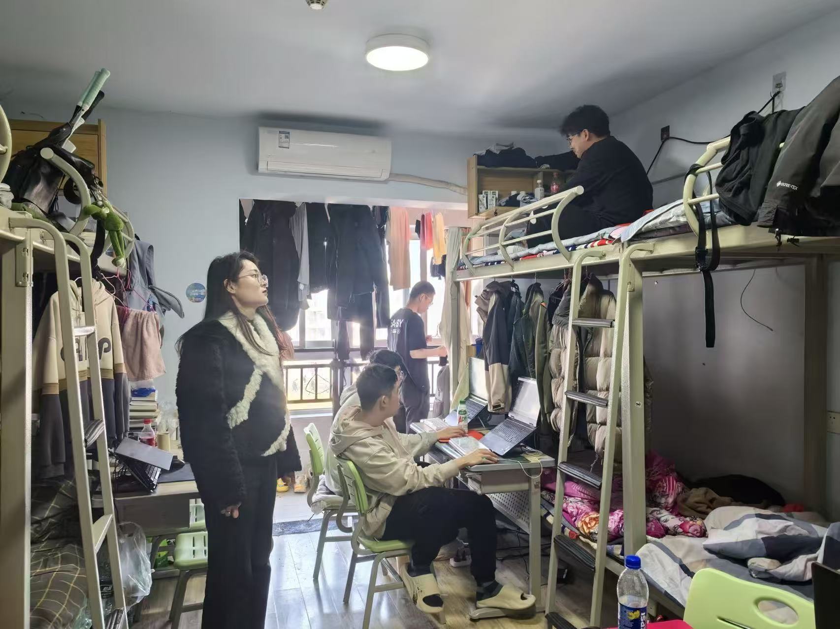 在生活方面,东野圣萍老师对宿舍的用电安全、卫生状况等进行了细致检查,提醒学生注意防火防盗,保持宿舍整洁。东野老师强调:“安全无小事,希望大家共同维护好宿舍环境,为学习和生活创造良好条件。”范克亮老师在走访过程同时关注学生思想动态与心理状态,倾听学生在宿舍人际关系、生活适应等方面的诉求,对学生提出的宿舍设施维修、生活服务优化等问题反馈都一一记录。
