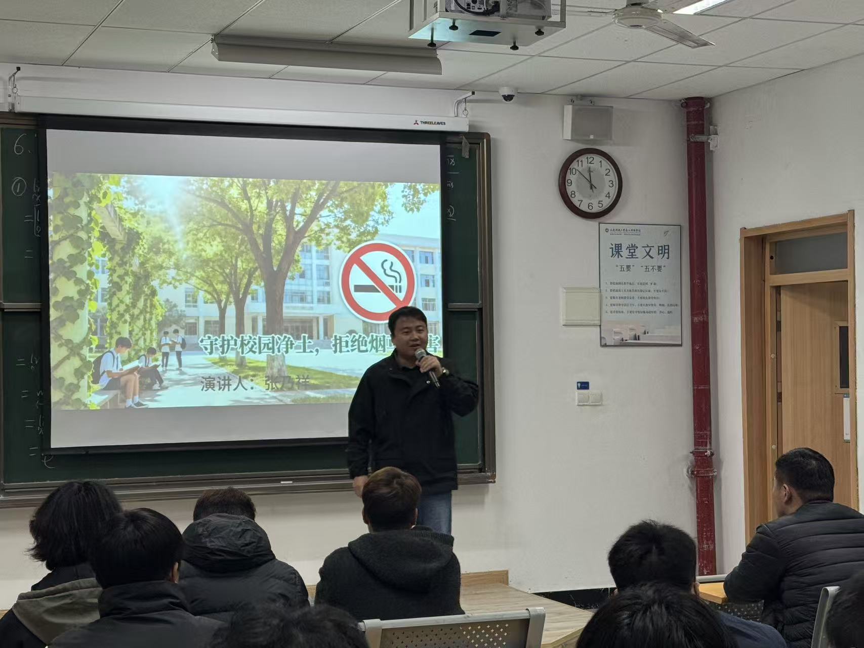 学院着重明确校园禁烟范围与违规后果,划定“零容忍” 红线:校园内教学楼、宿舍、图书馆、食堂、操场、走廊、卫生间等所有区域全面禁烟,严禁携带、存放烟品烟具,严禁随意丢弃烟蒂。同时,清晰传达学校查处力度与违纪处理标准,告知学生一旦违规,将依据相关管理办法严肃处理,轻者面临警告,情节严重者将受到校级处分,且违纪同学实行 “一票否决” 制,打消学生的侥幸心理。此外,辅导员们明确将开展不定期巡查,同时鼓励学生相互监督,发现校园内吸烟行为及时向老师或值班人员反映,形成齐抓共管的监管格局。