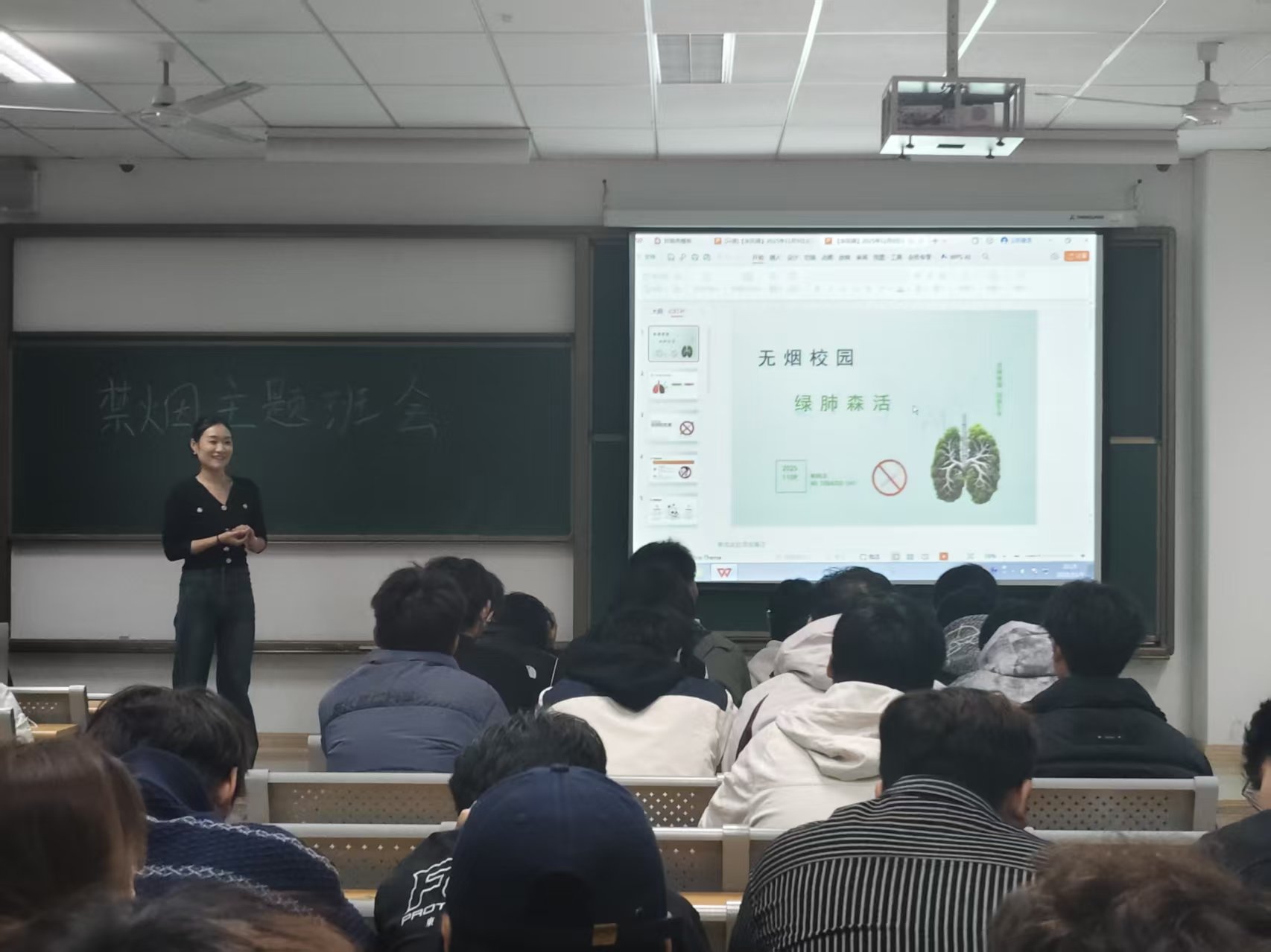 为营造清新、和谐、向上的学习和生活环境,刘安娜老师于周日晚上7:00,在J1-501教室召开“无烟校园,健康生活”主题班会。通过科学数据和真实案例,详细阐述烟草(包括电子烟)对个人健康、校园公共环境及校园消防安全构成的严重威胁,并向全体同学发出“拒绝烟草,从我做起”的倡议,希望同学们强化自律意识,严守校园禁烟规定,不在教学楼、图书馆、宿舍、食堂、体育馆等任何校园室内外公共场所吸烟,做到不吸烟、不递烟、不劝烟,更不随意丢弃烟蒂,用实际行动守护共同的校园空间。