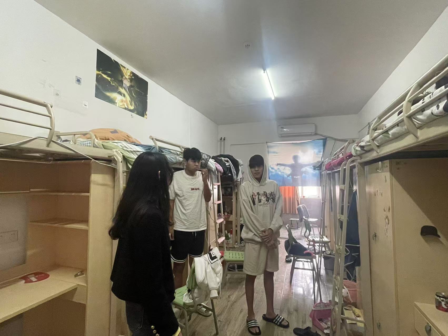 此外,10月22日,郭芳舟老师还对针对育英书院C 栋学生宿舍开展全覆盖走访。走访结果显示,多数宿舍整体状况良好,卫生整洁、物品摆放有序,学生作息规律,室友间相处和睦,学习氛围浓厚,部分宿舍还自发组建学习小组,形成了互帮互助的良好学习风气。但走访中也发现两点突出问题:一是少数宿舍存在晚归现象,经了解主要因学生参加完满活动或相关培训;二是个别宿舍电源使用不规范,存在手机充电器长期不拔、插排靠近床帘等安全隐患。针对这些问题,郭芳舟当场对相关学生开展安全教育,再次强调宿舍安全与作息管理规定,引导学生提高安全意识与规则意识,共同维护宿舍的安全与和谐。