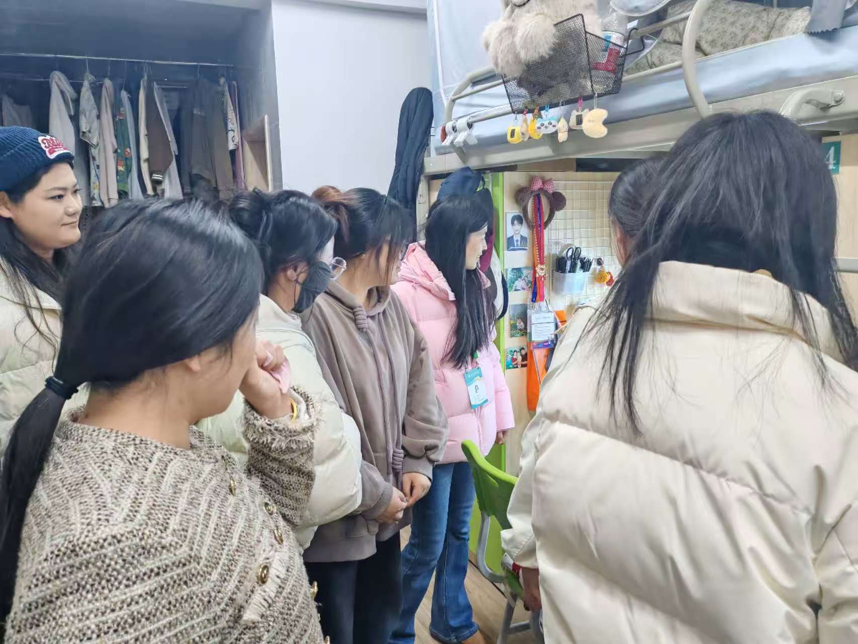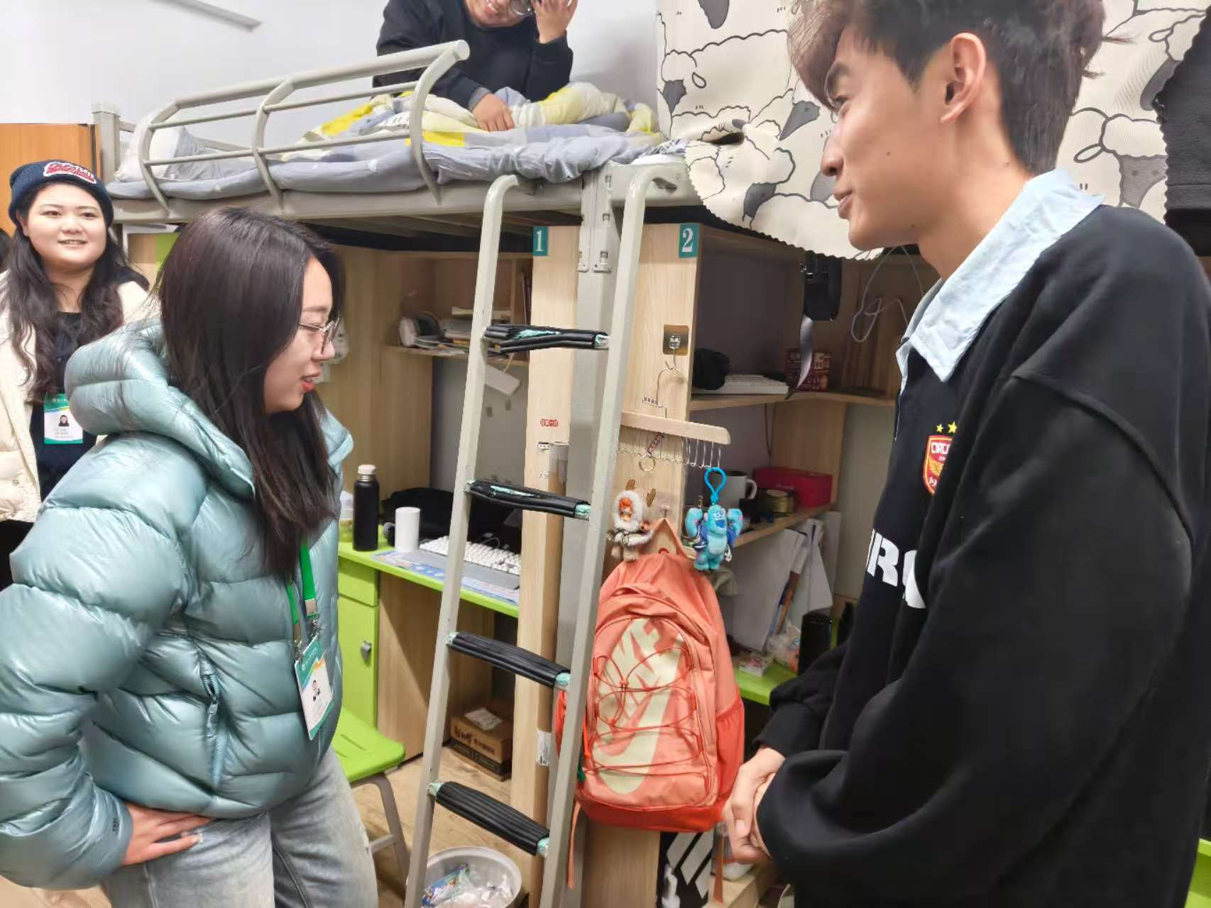 每走进一间宿舍,温馨融洽的氛围便扑面而来。老师们先是与同学们热情寒暄,随后自然地查看起宿舍的居住环境。从床铺整理的规整度、物品摆放的有序性,到书桌的整洁度、阳台的通风情况,老师们细细观察着宿舍的每一处细节,对同学们共同维护的干净整洁环境给予了肯定:“宿舍是大家在校期间的‘小家’,能把‘小家’打理得井井有条,既体现了大家的生活素养,也能让学习和休息更舒心。”对于个别需要改进的小细节,老师们也以建议的口吻温和提醒,让同学们在轻松的氛围中接受意见。