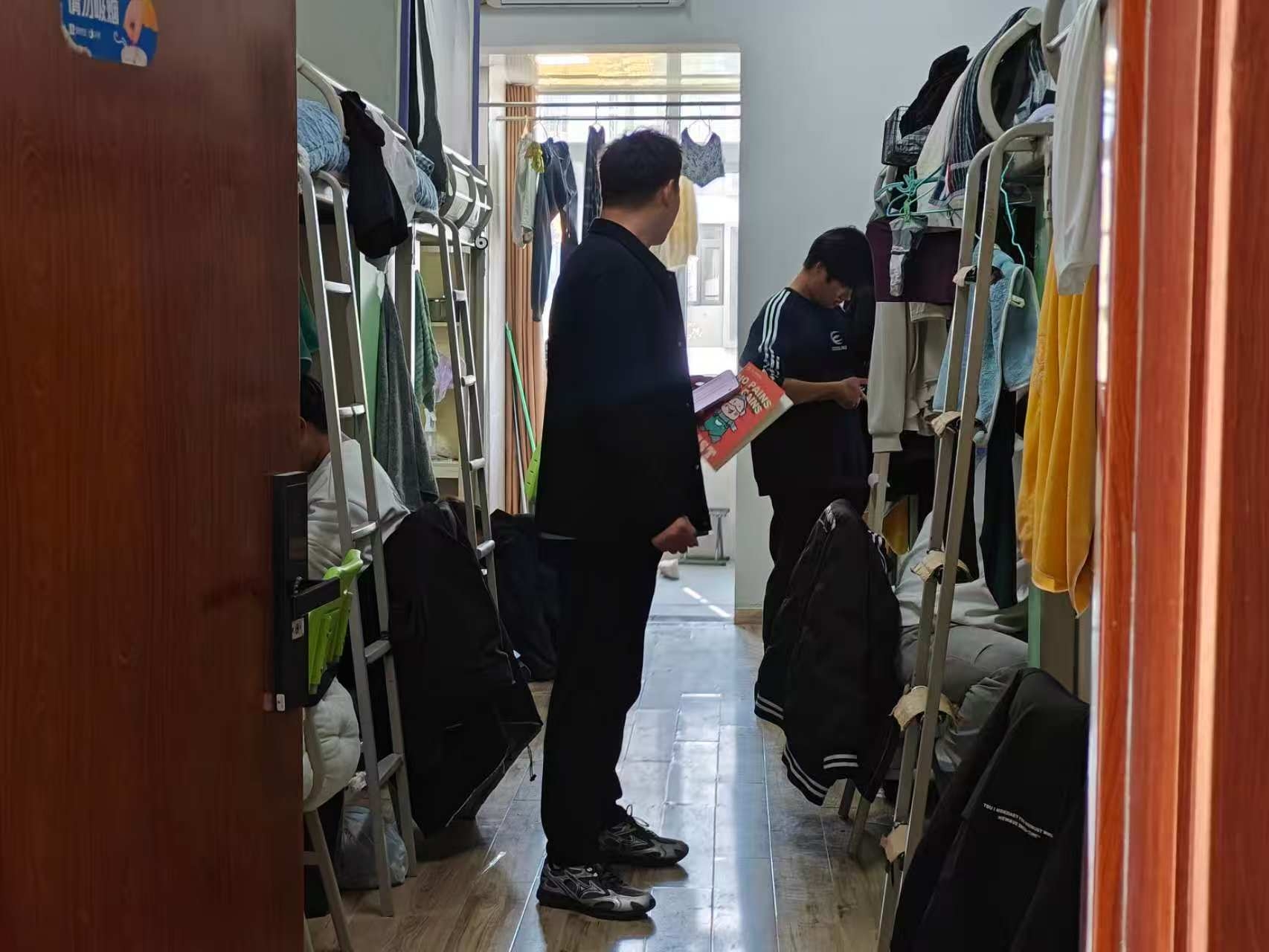 张乃祥老师仔细查看宿舍环境卫生与安全设施,提醒同学们注意用电安全、防火防盗,养成良好生活习惯;耐心倾听学习、生活中的困惑,针对学业规划、人际交往等问题给出实用建议,鼓励大家珍惜集体生活、互帮互助,营造和谐宿舍氛围。