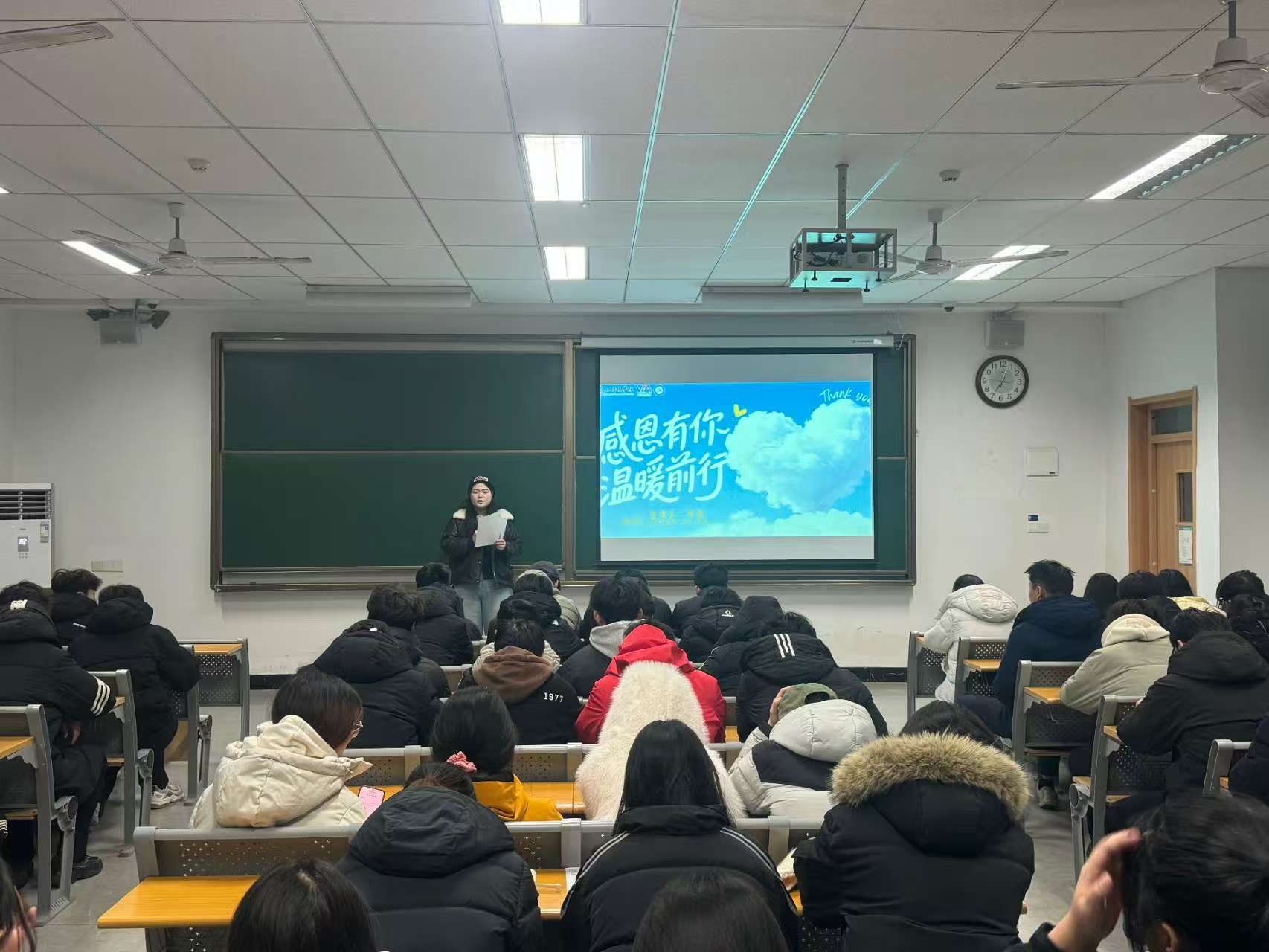 辅导员佟鑫老师面向2024级全体本科生组织开展了“感恩有你,温暖前行”感恩励志主题班会。班会上,佟老师围绕资助金的合理使用提出建议,引导同学们树立正确的消费观念,鼓励大家将资金主要用于学习资料、技能提升等方面,避免浪费和不必要的开支。在学风建设与励志成长方面,就时间管理、学习方法、参与社会实践等话题与同学们分享了自己的经验,鼓励全体同学珍惜在校时光,扎实掌握专业知识,积极参与各类学科竞赛与完满活动,将暂时的经济资助转化为长远发展的动力,以实际行动回报国家与学校的培养。