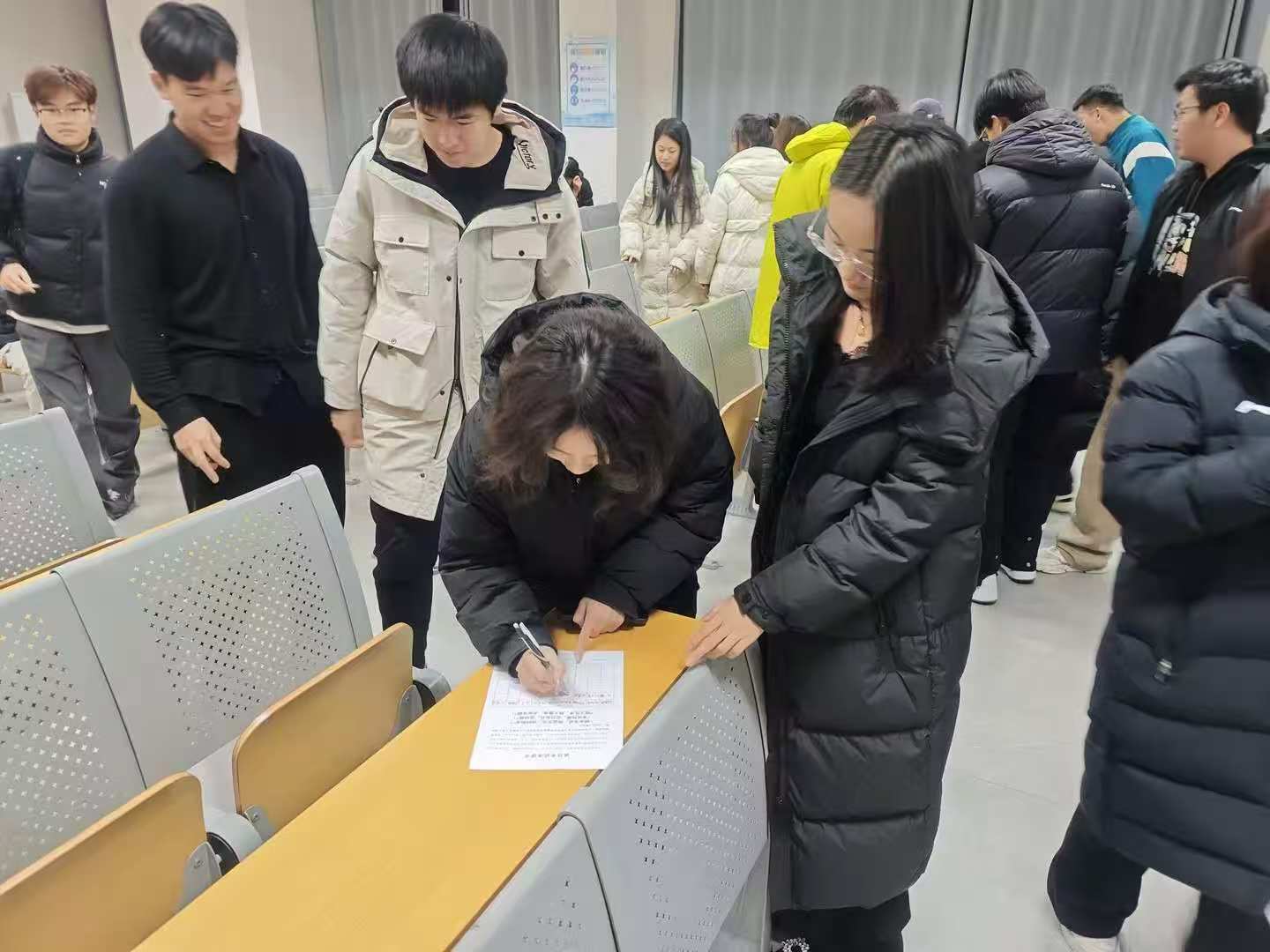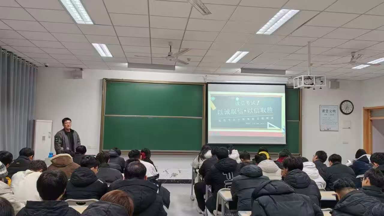 12月21日,辅导员刘安娜老师于J1-501举办了以“考之以诚,答之以信”为主题的诚信考试教育班会。班会上,辅导员深入讲解了诚信应考的重要意义,并结合学生手册课程考试管理规定条款内容以及典型警示案例,强调了违反考试纪律的严重后果。她指出,诚信不仅是考试的基本准则,更是每位学子立身处世的根本品质,号召全体同学端正态度、认真复习、凭实力取得真实成绩。参加班会的同学专注聆听,并在现场签署了《诚信考试承诺书》。大家纷纷表示,将自觉遵守考场纪律,坚决杜绝舞弊行为,共同维护公平公正的考试环境,以扎实学识和诚信品格迎接即将到来的考试。此次班会有力强化了学生的诚信意识与规则观念,为营造风清气正的优良学风奠定了坚实基础。