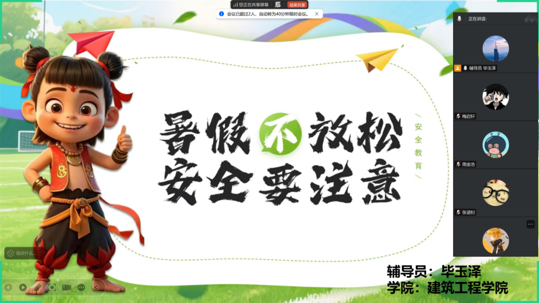 为深入贯彻落实立德树人根本任务,切实将学生安全放在教育工作首位,以扎实举措守护学生身心健康与生命安全,确保每位同学度过一个平安有序、富有意义的假期,建筑工程学院于近日组织开展线上暑期安全教育主题班会,由各辅导员主持,全体学生线上参与。