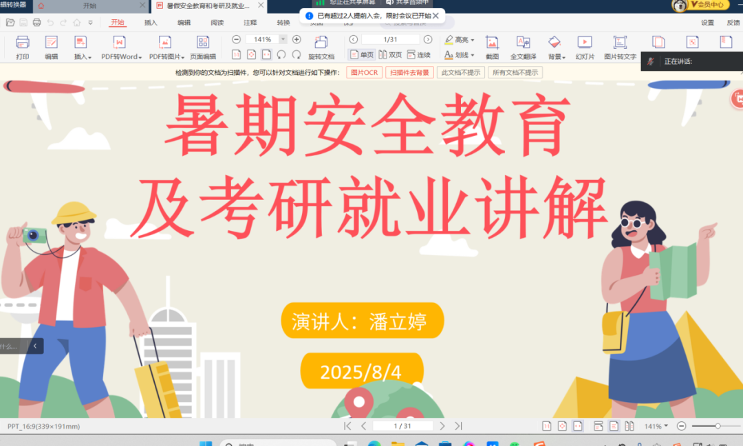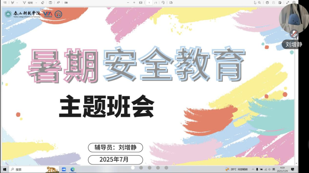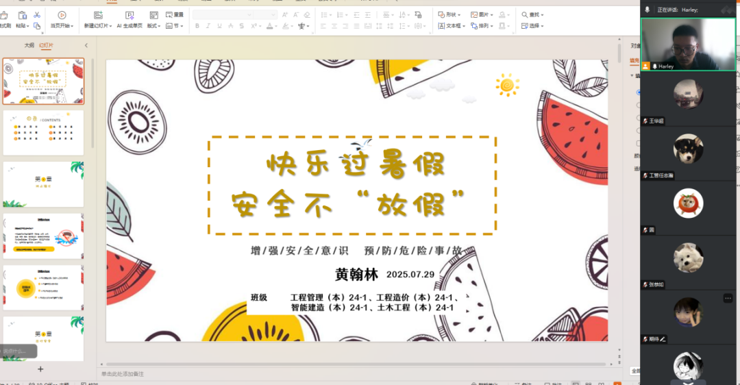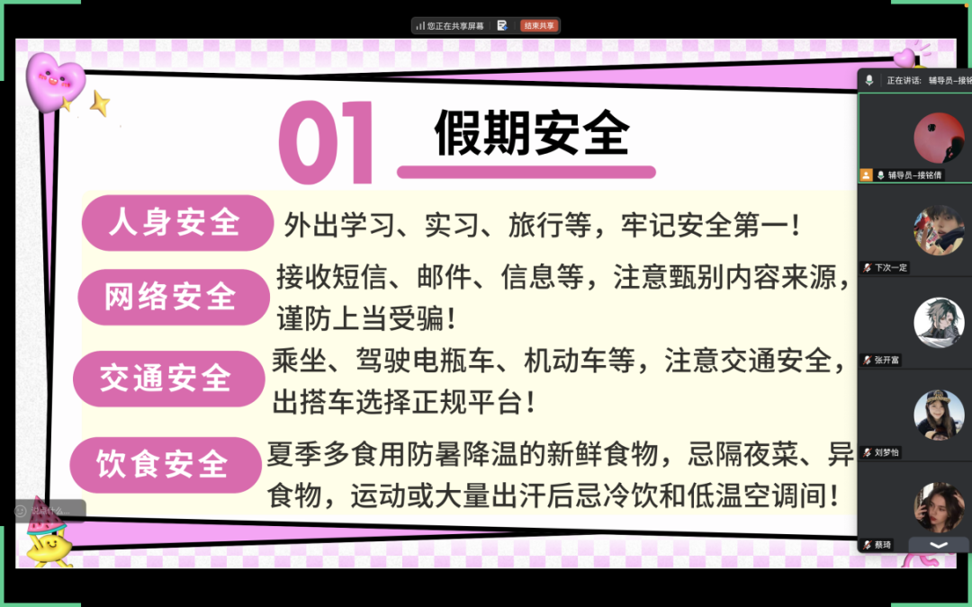 辅导员方艺组织召开了暑期安全教育线上班会。会上,方老师首先带领大家重点回顾了近期频发的典型安全事故案例,随后围绕暑期安全防护的多个关键领域展开了详细讲解,内容涵盖防溺水安全知识的普及、个人信息安全防范要点、日常出行安全注意事项以及心理健康维护技巧等。方老师指出,新学期开启后同学们将获得“应届毕业生”身份,结合就业市场的实际情况剖析了就业形势,鼓励大家积极把握招聘机会,利用各类资源,合理调整就业心态与预期目标。