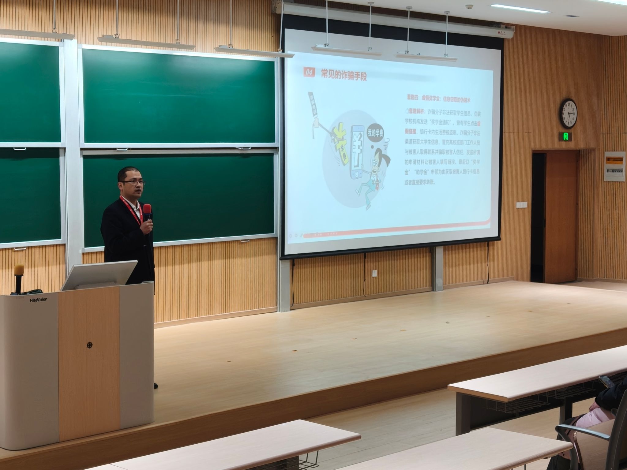 随后,李凯老师以通俗易懂的语言、丰富翔实的案例,围绕校园高发诈骗类型展开深入讲解。针对学生群体常见的“虚假校园贷”“刷单返利诈骗”“冒充客服退款诈骗”“冒充老师收取费用诈骗”等四类骗局,——多以“低利息、高回报”“紧急需求”为诱饵,或通过精准获取个人信息获取信任,进而诱导转账汇款。期间,他结合近期发生的真实案例,还原诈骗全过程,让在场同学直观感受到诈骗陷阱的隐蔽性与危害性,深刻认识到提高防范意识的重要性。