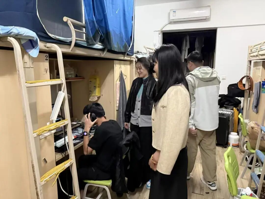 田阳老师深入九河书院学生宿舍,走访以排查安全隐患为重点,既检查宿舍学习生活氛围与内务整理,也全面排查消防安全、网络安全,并逐一查看用电设备规范使用情况,以规范用火用电、避免危险。此次走访有效排查了宿舍管理薄弱环节,提升学生安全责任意识,彰显学院对学生住宿环境与成长安全的关切,为和谐校园奠基。