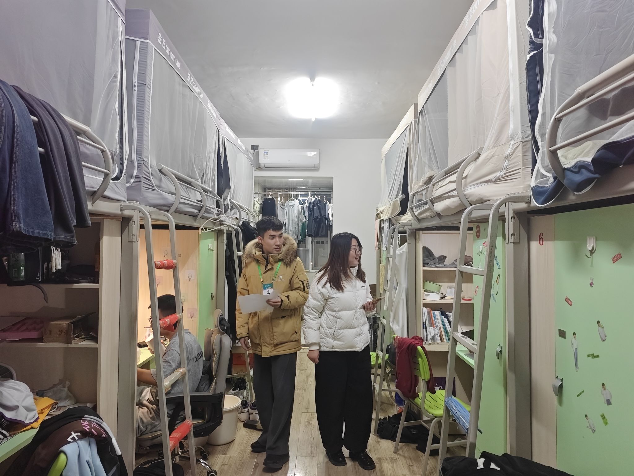 此次走访累计深入57间学生宿舍,与335名学生进行了深度交流。走访过程中,各位辅导员老师逐间走访宿舍,仔细查看各项安全隐患点,检查同学们宿舍门窗是否完好、人走是否断电,宿舍内是否有违规电器,以及宿舍是否存在吸烟。他们着重向同学们强调:不要使用违规电器,不要在校园内燃放烟花爆竹,强化寝室防火防盗意识,时刻警惕各类诈骗手段,同时要坚持做好日常卫生维护,引导大家共同筑牢校园安全防线。