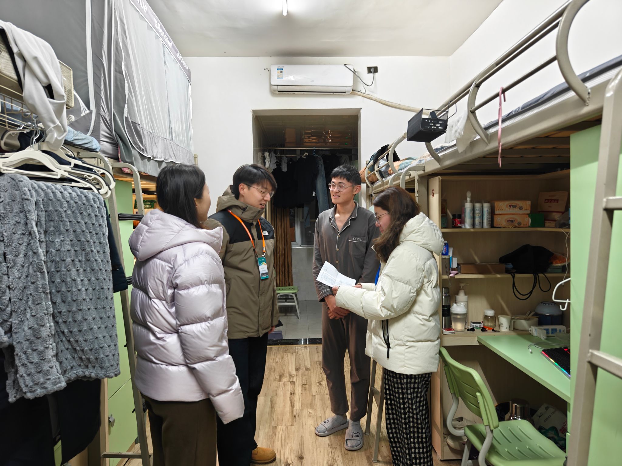 假期临近,为扎实筑牢校园安全防线,切实保障学生人身与财产安全,系统排查宿舍区域潜在风险点,营造安全有序、整洁规范的住宿环境。2025年12月30日智能工程学院全体辅导员深入东岳书院A栋,汶阳书院C、D栋开展节前寝室走访活动并进行宿舍安全隐患排查。