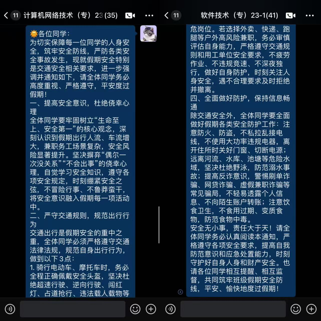 为确保安全教育全覆盖、无死角,学院通过腾讯会议开展线上专题班会,结合真实案例深度解读安全规范;依托班级群持续推送详实的安全提醒与应急处置流程;针对毕业生、实习学生等重点群体,开展一对一沟通,摸排外出与兼职情况,建立动态联系机制,反复叮嘱学生外出前向家长与辅导员报备行程,保持通讯畅通,遇紧急情况第一时间报警求助。