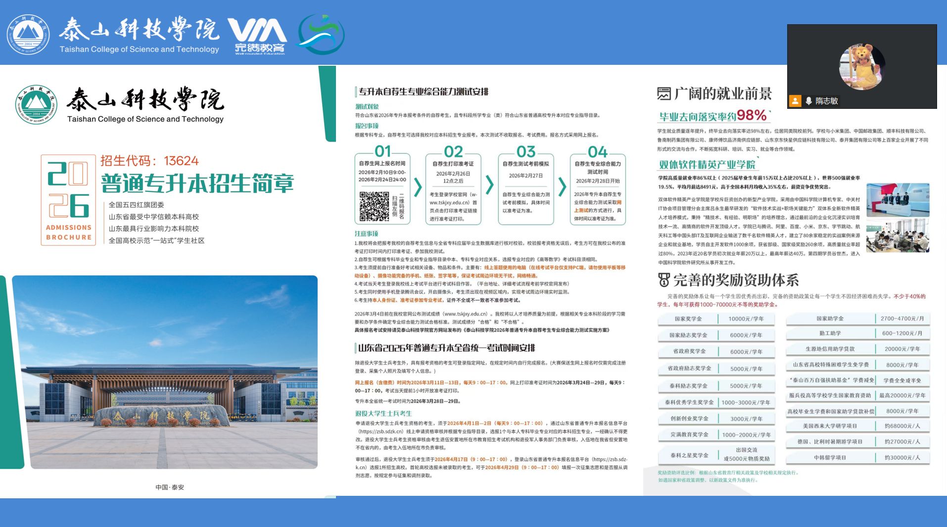 此外,为进一步提升政策解读的专业性与精准度,强化宣讲效果,大数据学院主动对接招生处,特邀招生处马晓雨老师开展专场线上政策解读宣讲会。本次宣讲会专门面向专科毕业班有专升本意向的学生及家长共同参会。宣讲过程中,马晓雨老师围绕学生和家长最关心、最关注的核心问题展开细致讲解,详细介绍了2026年专升本自荐考试的报名流程、报名条件、考试方式、考试科目及时间安排,结合历年报考数据,系统分享我校录取分数线,并与同类院校进行客观对比分析,直观展现学校办学优势与报考价值。同时,老师结合多年招生工作经验,为学生提供科学的志愿填报指导与备考建议,鼓励大家合理定位、积极报考,稳步实现升学目标。整场宣讲内容详实、重点突出、实用性强,有效解决了学生和家长在备考、报考中的迷茫与顾虑。