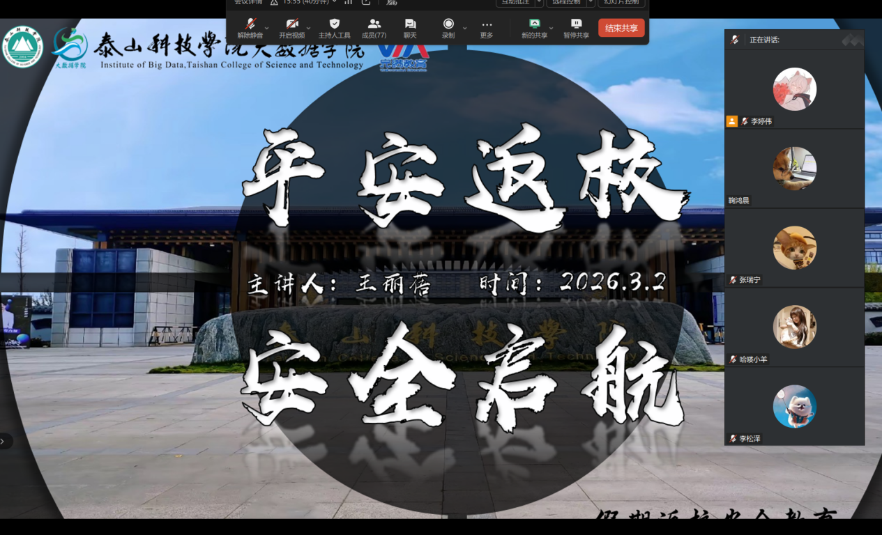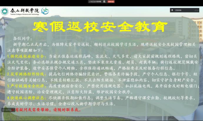 寒假尾声,新学期将至,为切实保障学生平安有序返校,筑牢校园安全防线,泰山科技学院大数据学院组织全体辅导员通过线上班会、班级群通知、精准推送提醒等多种形式,开展全方位、多维度的返校安全教育工作,为学生顺利开启新学期保驾护航。