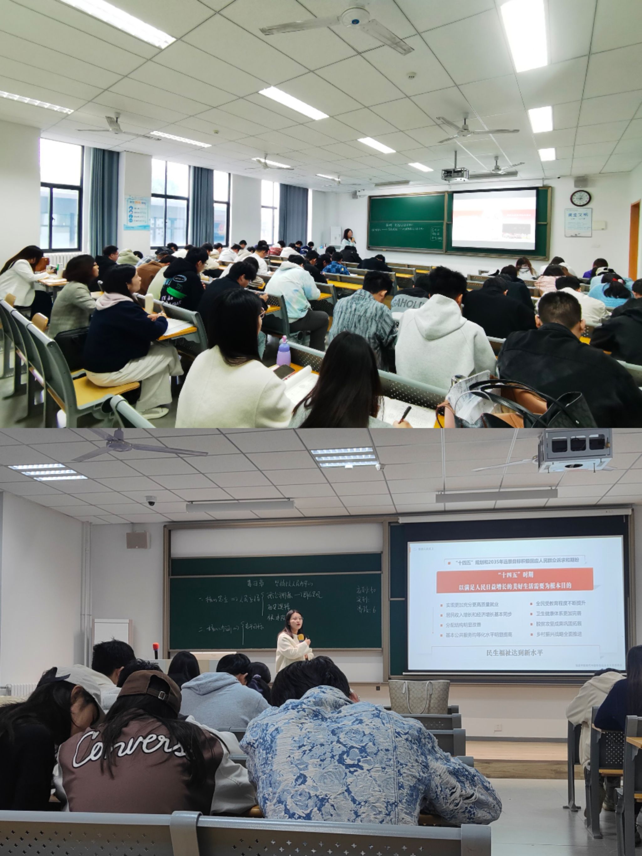 杨涵老师以习近平总书记2025年新年贺词导入课堂,构建了“人民的重要性—坚持人民至上—全面落实以人民为中心”的三阶教学逻辑,引导学生循序渐进理解课程内容。张彤老师则从“理论渊源—历史逻辑—根本政治立场”三个维度展开分析,系统梳理了以人民为中心的发展思想与马克思主义人民性的本质关联。