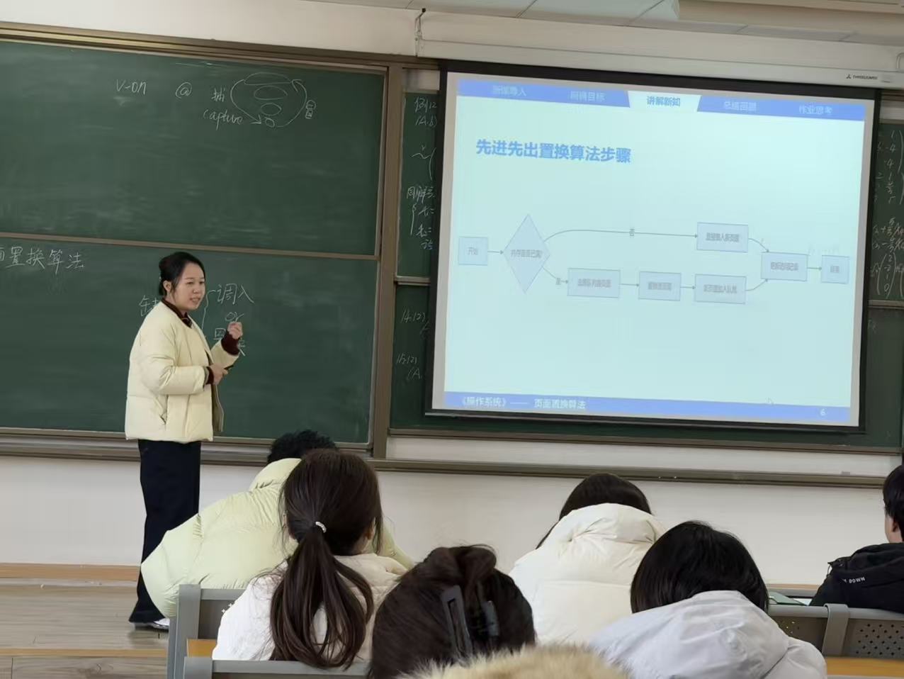 孙玉竹老师以“页面置换算法”为授课内容,针对知识点抽象、逻辑复杂的特点,采用“理论建模-实例推演-对比分析”的教学模式。她从内存管理的核心需求出发,通过图表可视化方式呈现页面置换的基本流程,详细讲解先进先出(FIFO)、最近最少使用(LRU)、时钟算法(Clock)等经典算法的原理与实现步骤。针对算法逻辑的易错点,她通过课堂提问、即时练习等方式强化学生记忆,帮助学生构建起完整知识链条。
