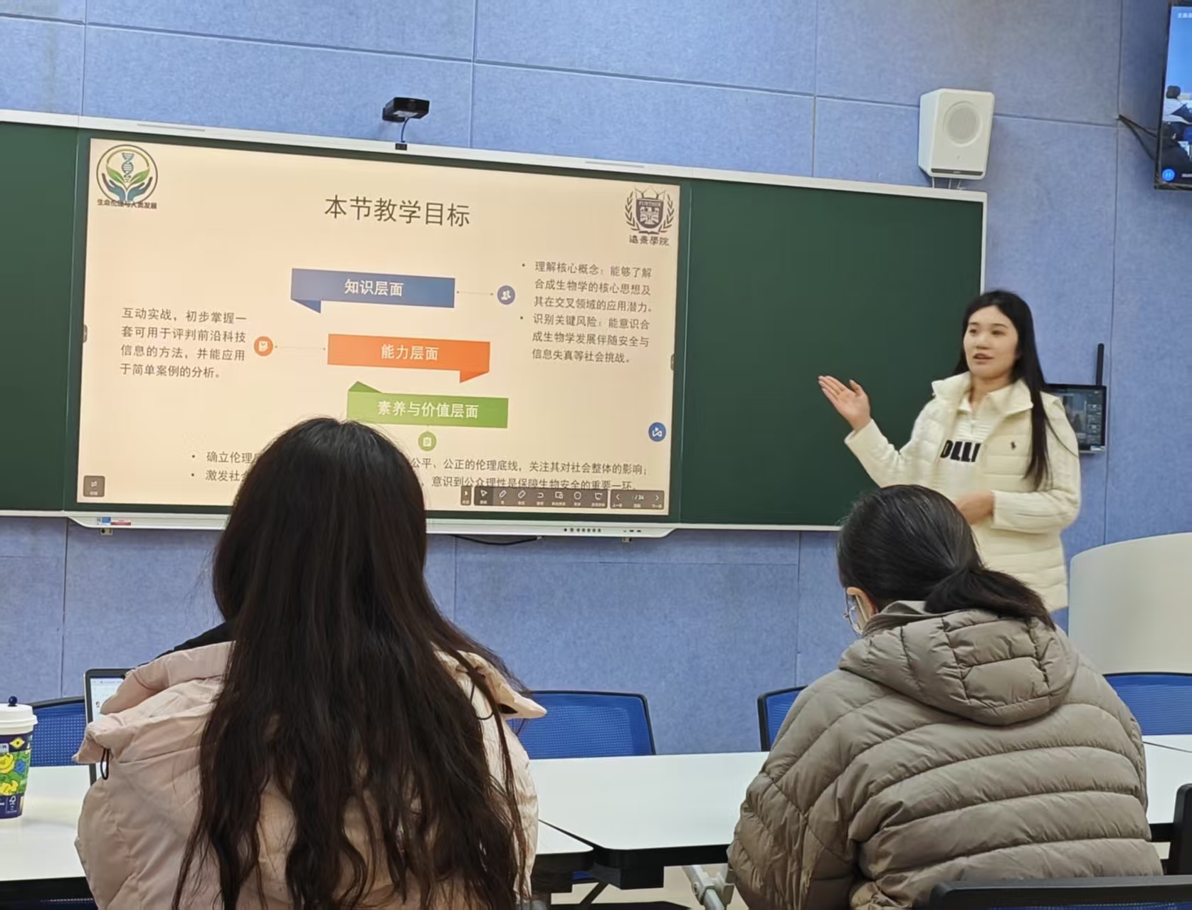12月5日,李莹老师在《生命伦理与人类发展》的“合成生物科学甄别战”章节教学中,以“哪吒重塑肉身”与“莲藕造骨”科研成果对比引入主题,采用“闯关式”课堂结构,通过“女巫的毒药”互动活动,引导学生总结科学信息甄别法则,凸显培养理性公民的教学目标。观摩教师称赞李莹老师的课程内容衔接自然、案例运用得当,牛志萍院长肯定其进步的同时,也提出优化教姿教态、材料规范性等改进建议。杨美丽老师在《大学英语3》的《The Surprising Purpose of Travel》教学中,以“旅行翻车”短视频导入,结合AI语音技术辅助发音练习,通过合作探究、情景表演等形式,引导学生理解文本“先抑后扬”的写作策略,实现语言学习与技术辅助、情感表达的深度融合,其创新的教学形式与扎实的教学功底获得在场教师一致好评。