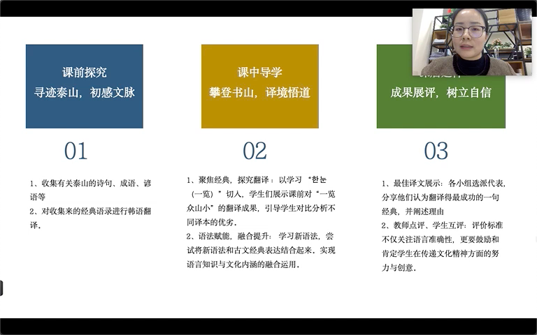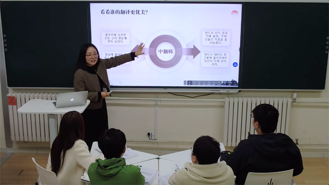 李妍妍老师的获奖案例紧扣大赛宗旨,以其主讲的韩语专业课程为载体,深入挖掘语言材料中的思政元素,巧妙地将传统诗歌文学与外语学习相融合,将文旅产业发展、文化自信与国际视野培养也融入到了语言技能训练之中。她的教学设计不仅注重语言知识的传授与跨文化交际能力的培养,更强调通过真实语境与任务导向的教学活动,引导学生在学习外语的同时,深刻理解中国道路、弘扬中华优秀传统文化,增强民族自豪感与责任感。案例充分运用数字化教学资源与互动平台,创新课堂组织形式,体现了“以学生为中心”的教学理念与思政教育的自然渗透,获得了评审专家的高度认可。