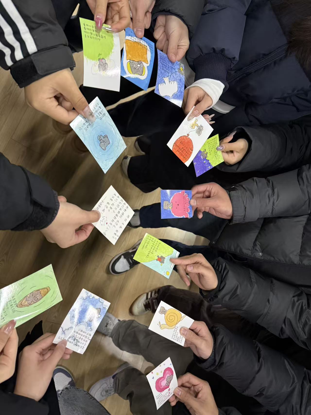 活动伊始,抽取冬日能量卡环节迅速点燃现场氛围。一张张写满暖心寄语与治愈小贴士的能量卡,让同学们在随机抽取的惊喜中收获专属鼓励,瞬间驱散了冬日的寒意。随后,三位同学主动走上台前分享解压妙招,有人推荐沉浸式阅读与运动流汗的宣泄方式,有人分享与好友倾诉、记录手账的治愈技巧,真诚的分享引发全场共鸣,也为大家提供了多元的解压思路。