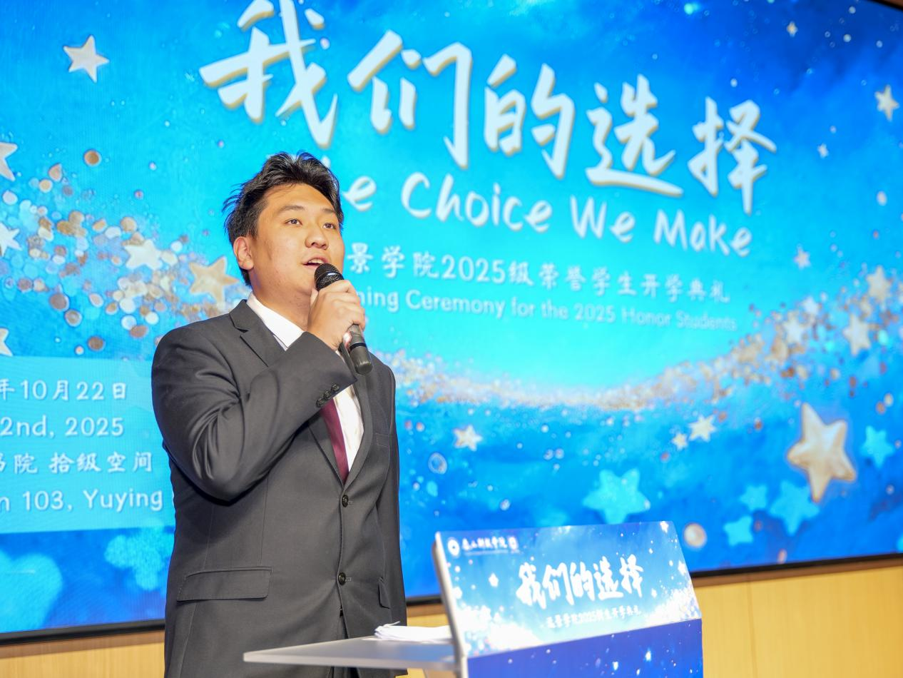 远景学院院长牛志萍宣读了录取通知,欢迎123位新同学加入远景大家庭。她向新一届荣誉学生们表示祝贺,正是每个人那份坚定的选择,让今天的故事得以开场。并期待所有同学在这片新天地里勇敢探索、尽情成长,让独特的个人光芒在此交相辉映,共同写下这场“双向选择”后更为精彩的篇章。