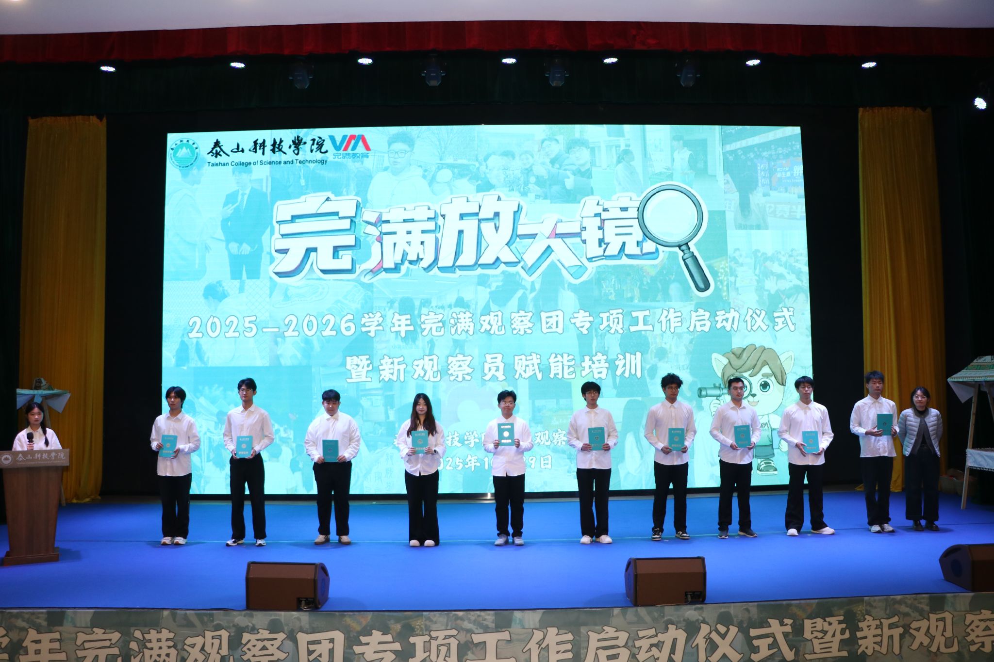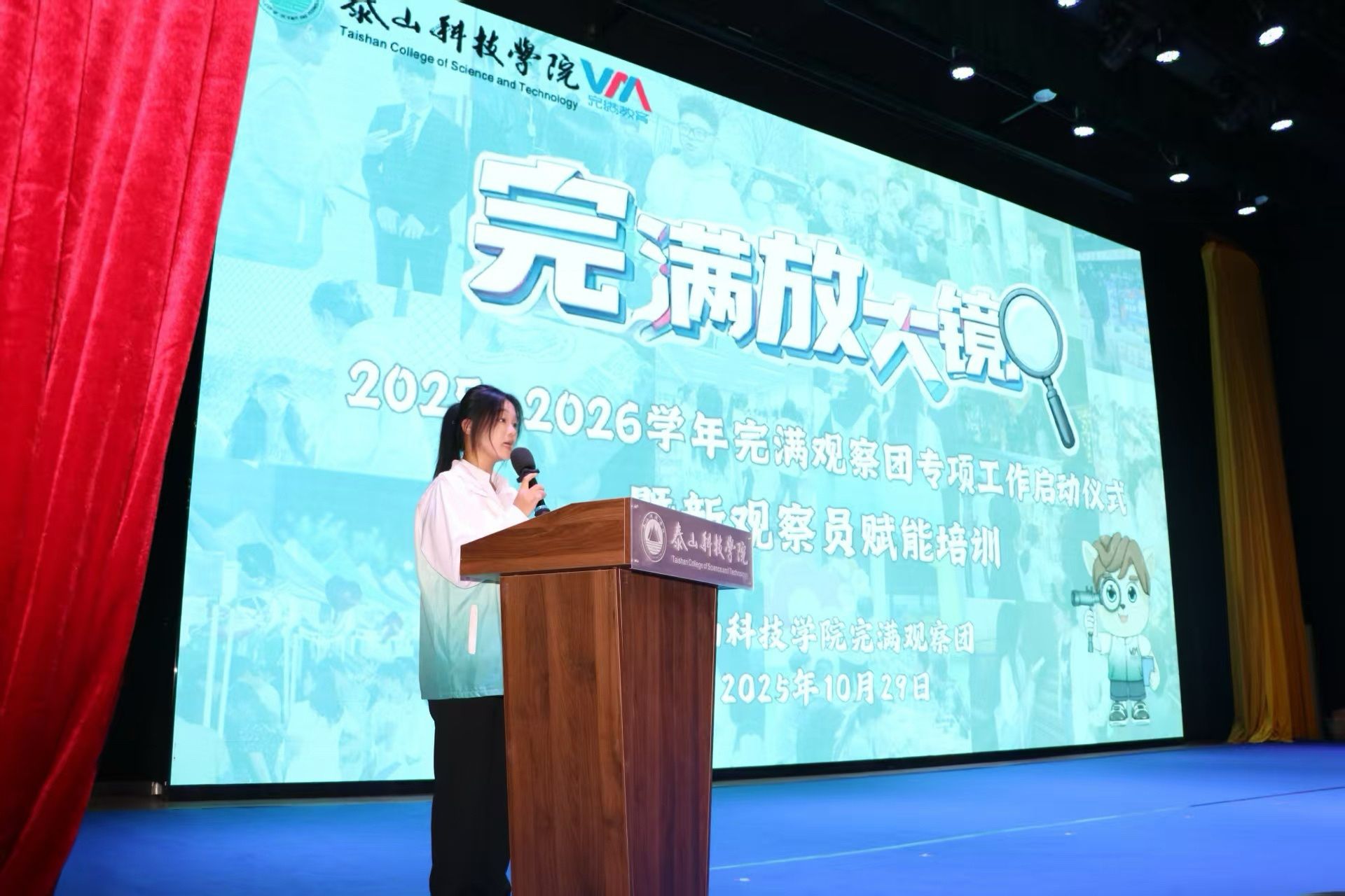 当情景剧的最后一幕结束,现场掌声渐息,活动正式转入启动仪式环节。首先由校级完满观察分团指导老师邱信伟宣读了《关于启动新学年泰山科技学院完满观察团专项工作的通知》,明确了新学年完满观察团“聚焦活动实效、链接学生需求、助力完满升级”的三大核心任务,同时公布了观察团的组织架构与分团职责,为后续工作的有序开展划定了框架。