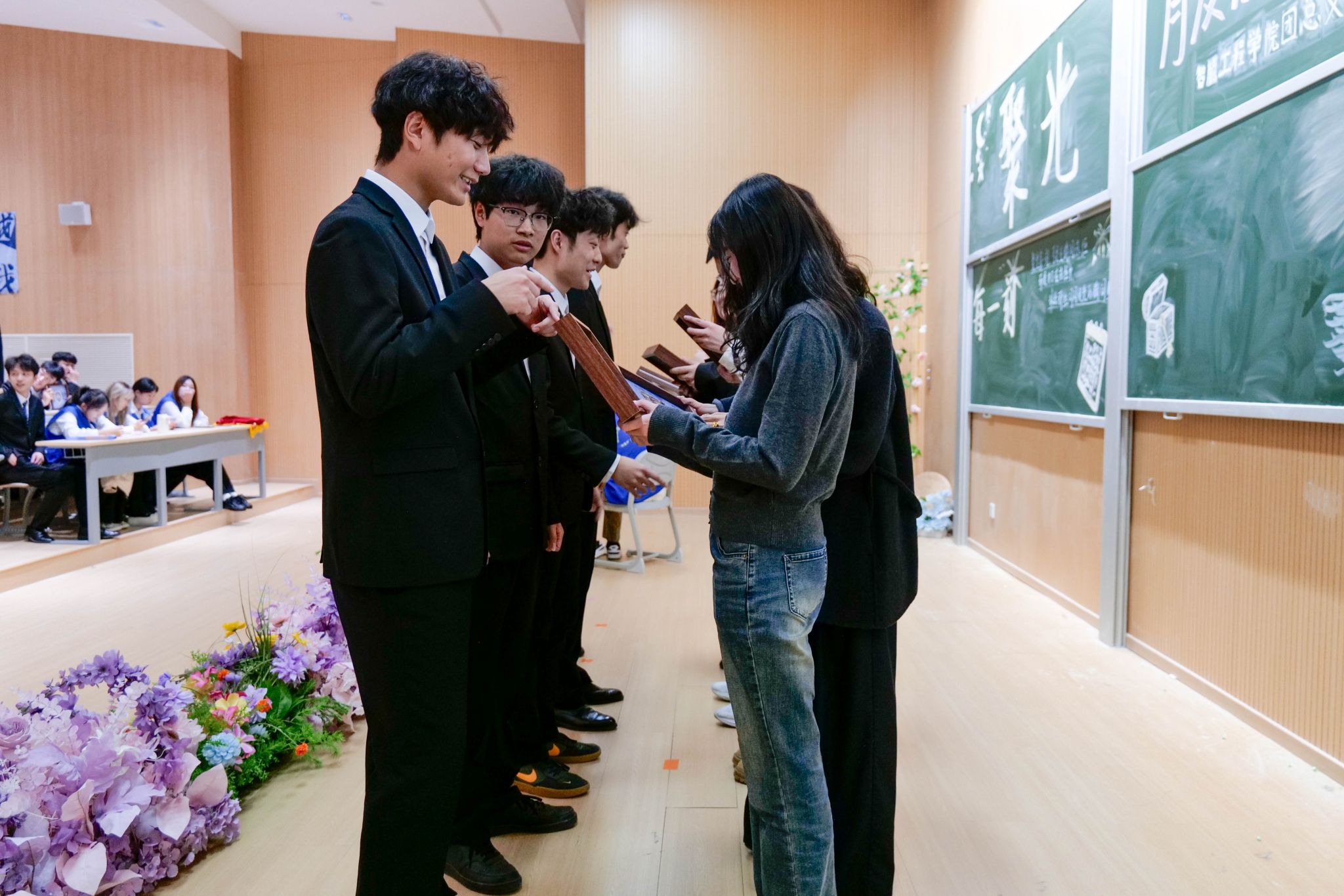 大会最戳人的瞬间,莫过于师生间双向奔赴的温情。惊喜环节里,部门代表捧着沉甸甸的相册走向指导老师,相册里印满了所有人的签名和合影——有深夜讨论方案的专注身影,有活动成功后的灿烂笑脸,每一张照片都定格着并肩奋斗的时光;老师们则回赠了手写的“夸夸信”,没有空泛的口号,全是“你熬夜修改的活动方案很用心”“这次志愿活动组织得很到位”这样具体又温暖的肯定,让每个人都感受到自己的付出被认真记在了心里。