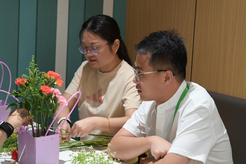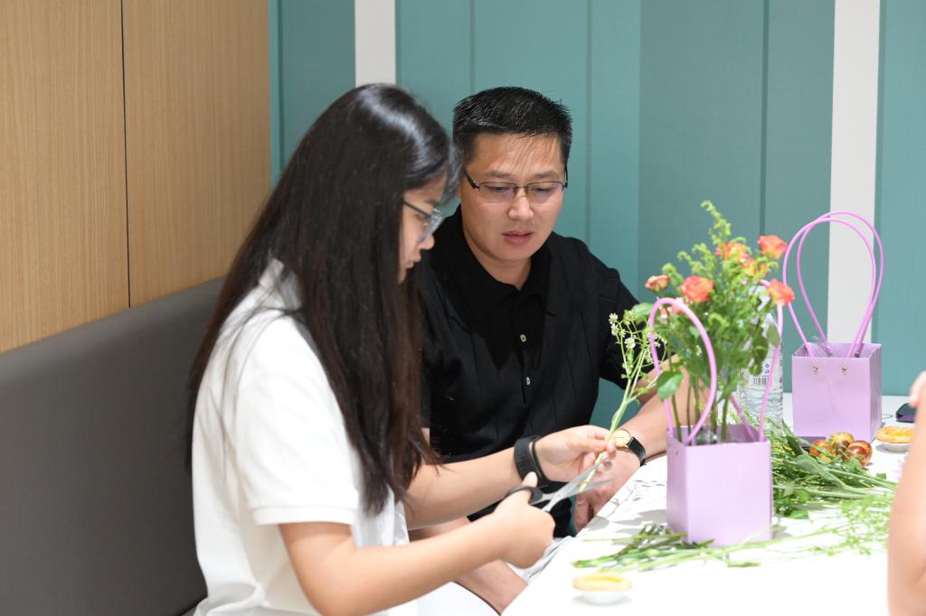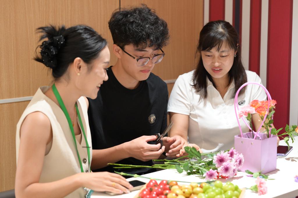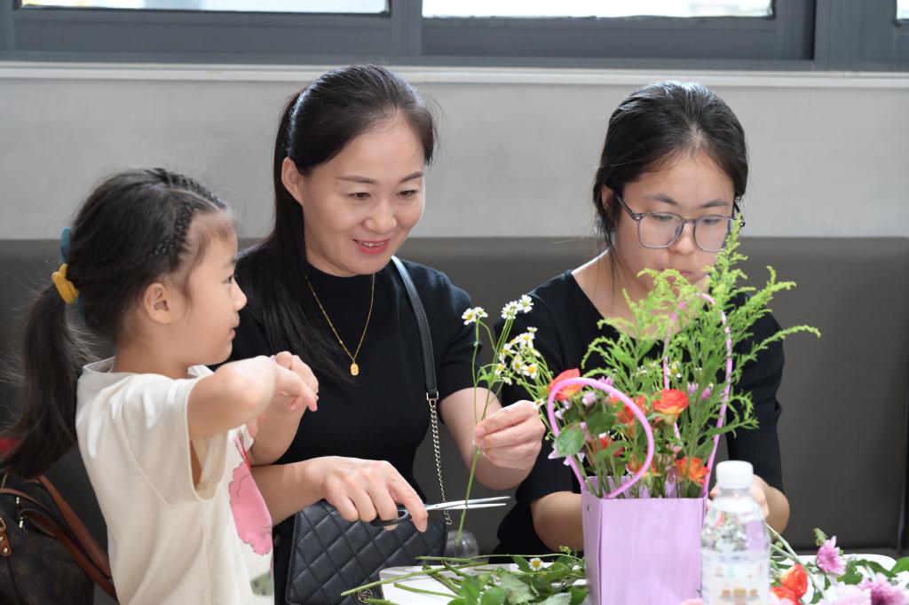 每组家庭分到一篮花材:多头玫瑰、康乃馨、小雏菊、尤加利叶……家长与孩子并肩而坐,精心挑选花枝、搭配色彩,现场顿时变成“花样创作现场”:有的妈妈主导审美,孩子负责打下手;有的家庭“各插各的”,最后再融合成一道风景。一位家长一边调整花枝角度一边分享道:“希望孩子在大学像这束花一样,向阳生长,绽放精彩。”花香混着笑声,原本还稍显拘谨的场面彻底打开。