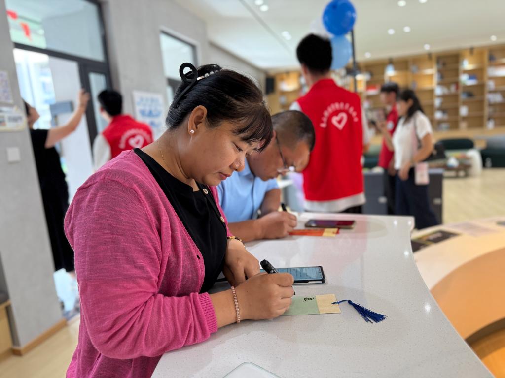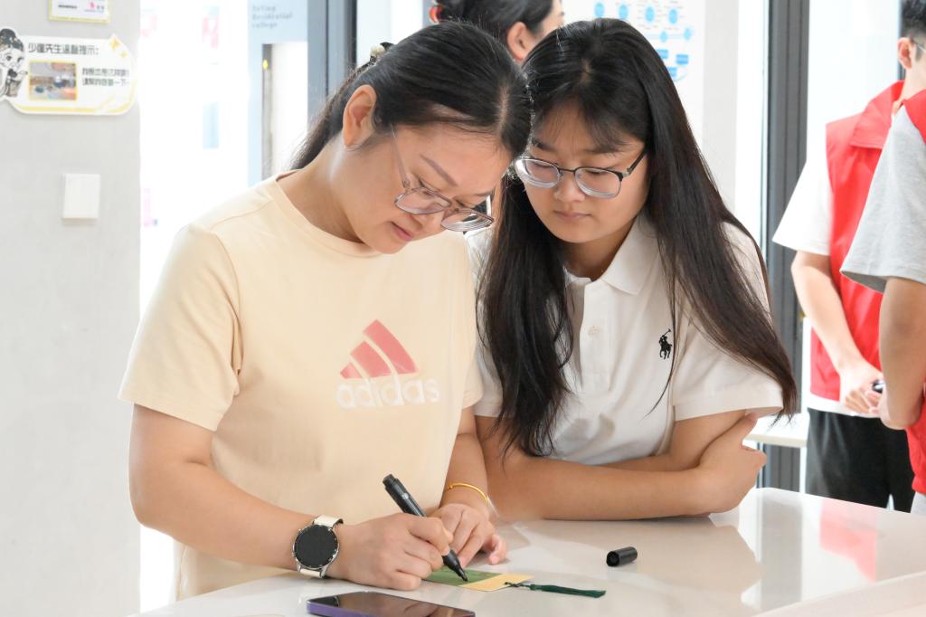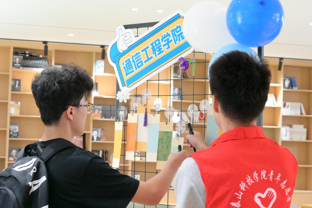 新生与家长满怀好奇,有序走进育英书院纸牍空间活动室,现场处处散发着温暖的气息。在签到处,每个家庭都收到了一张特制书签。精致的书签上,家长写下“学有所成、不负韶华”的殷切期望,新生许下“探索未知、突破自我”的成长心愿。这些小小书签被串起、悬挂,成了一道“家校寄语墙”。一位爸爸一边写一边笑:“这比我当年大学报到可有意思多了!”