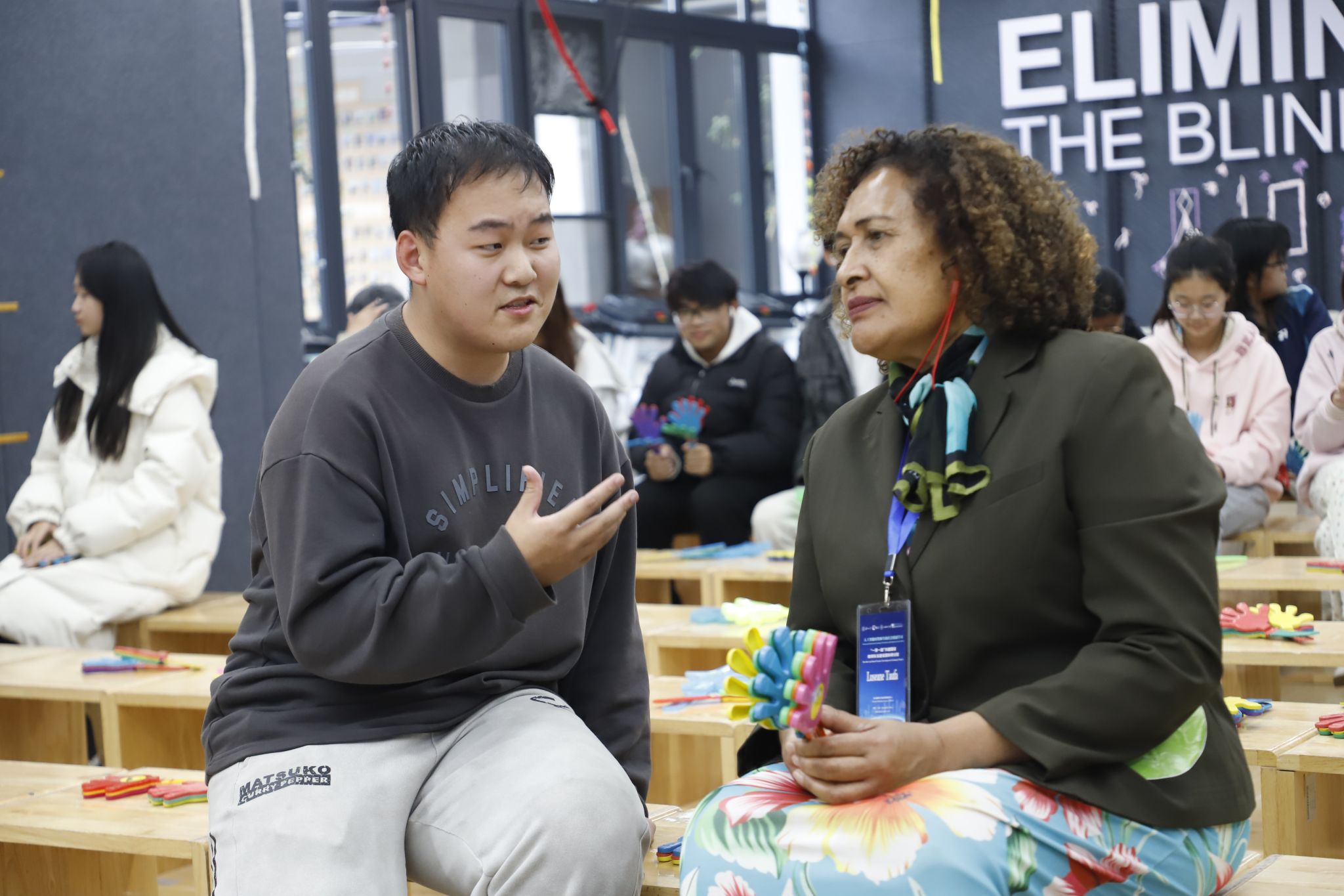 (图为泰科学生与外国嘉宾体验扎染作品)