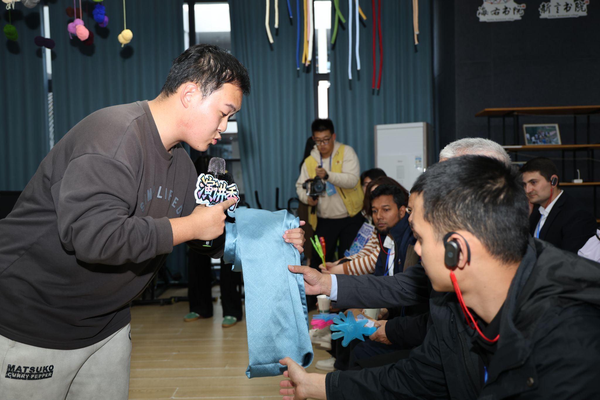 活动现场特设的文化体验成为交流热土。国际友人们抚触扎染的纹理,品尝山西陈醋的醇厚,并在“煎饼大使”——通信工程学院/育英书院的王子硕的指导下,学习山东煎饼地道的卷法与吃法。从摊制到入口,这道质朴的地方美食成了最生动的国际语言。