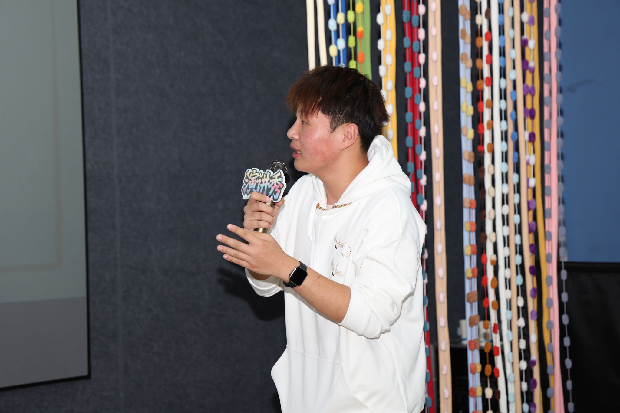 演讲秀在三位同学的创意展示中拉开序幕。来自大数据学院/敢当书院的周缨峻带来了她在书院工坊创作的扎染作品。“起初,每一块布料都不听使唤”,她坦言失败是探索的起点。但正是那些“不完美”的褶皱与晕染,让她领悟到手工的温度:“机器追求整齐划一,而扎染的每一道纹理,都是我们情感的独特投射。”