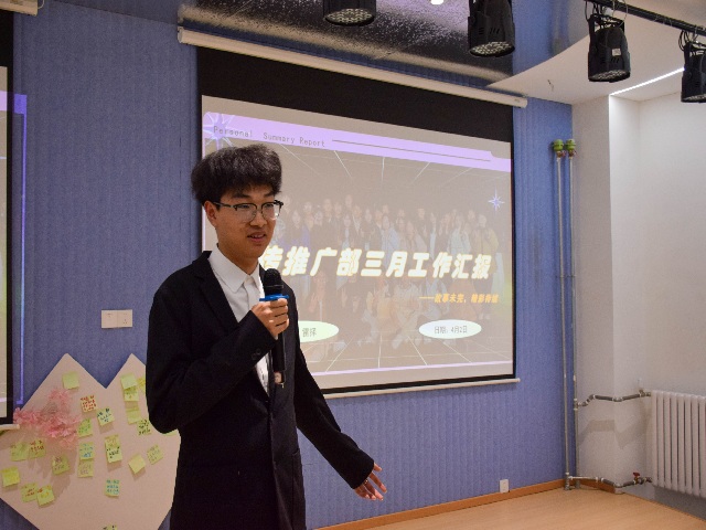 掌声落下,现场气氛专注而热烈。主席团成员李兆乾上台分享了他在3月份的工作感悟。他提示各位部长,在全力以赴完成工作的同时,也不要忽略了对新生力量的培养与关注。他动情地说道,“每个人都有成长的空间,每个人都有潜藏的能力,多一份包容,多一次机会,就能收获意想不到的惊喜。”