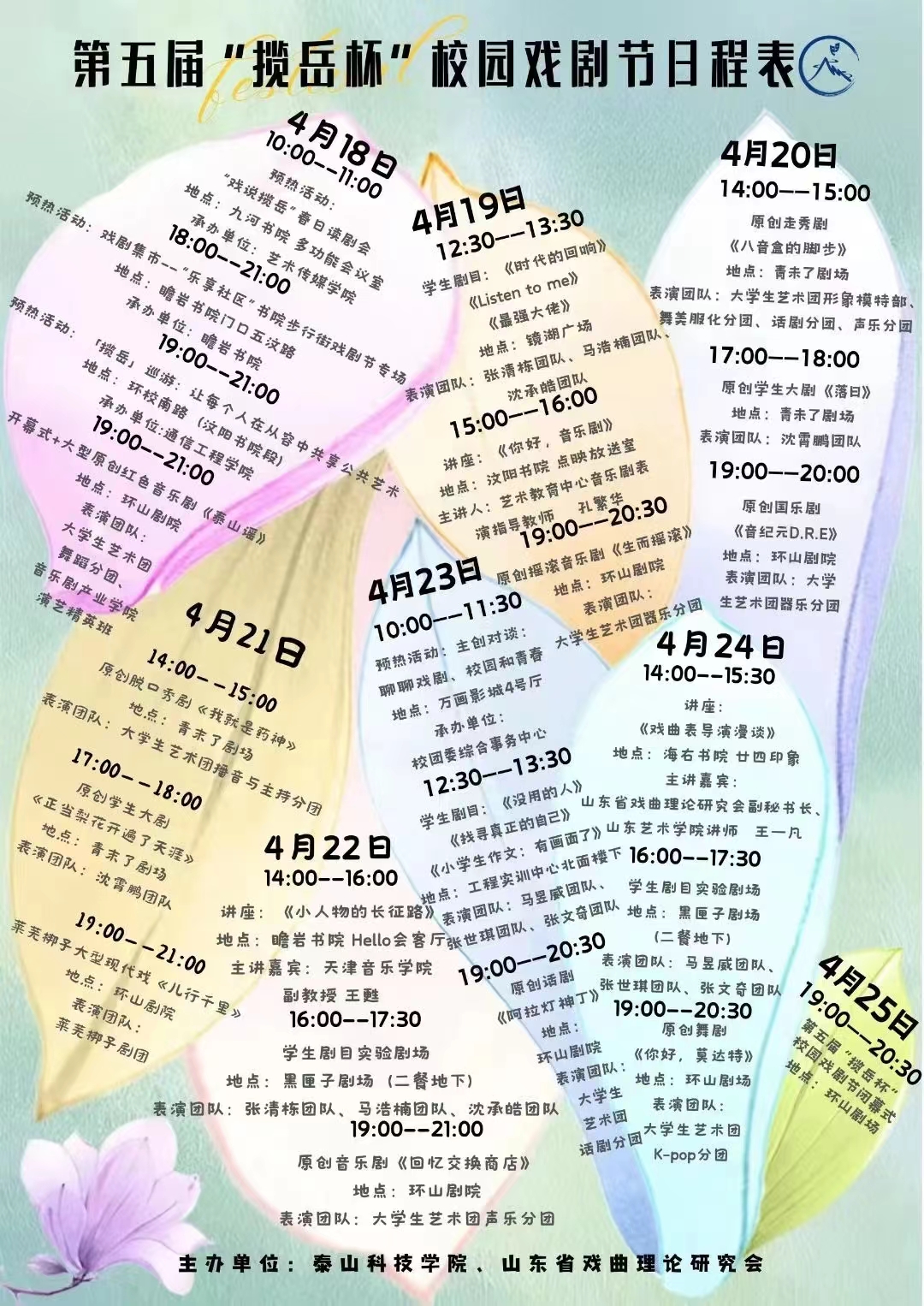4月18日晚,泰山科技学院第五届“揽岳杯”校园戏剧节在环山剧院盛大开幕,在接下来为期8天的时间里,艺术教育中心及各学院、书院等将为全校师生带来10部原创大剧作品,若干短剧,3场学术讲座及多场线下外围活动,为全校师生奉上“足不出校的艺术大餐”!