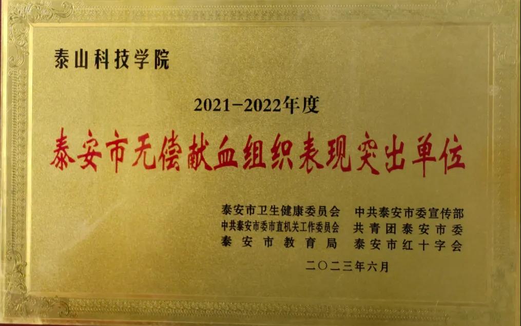此前,我校已多次获得“山东省无偿献血组织表现突出单位”“泰安市无偿献血组织表现突出单位”等省、市级表彰,两支服务队荣获“泰安市无偿献血志愿服务表现突出集体”,9名学生荣获“泰安市高校无偿献血标兵”,6名师生被评为优秀教师、优秀学生,整体献血量位居泰安高校前列。