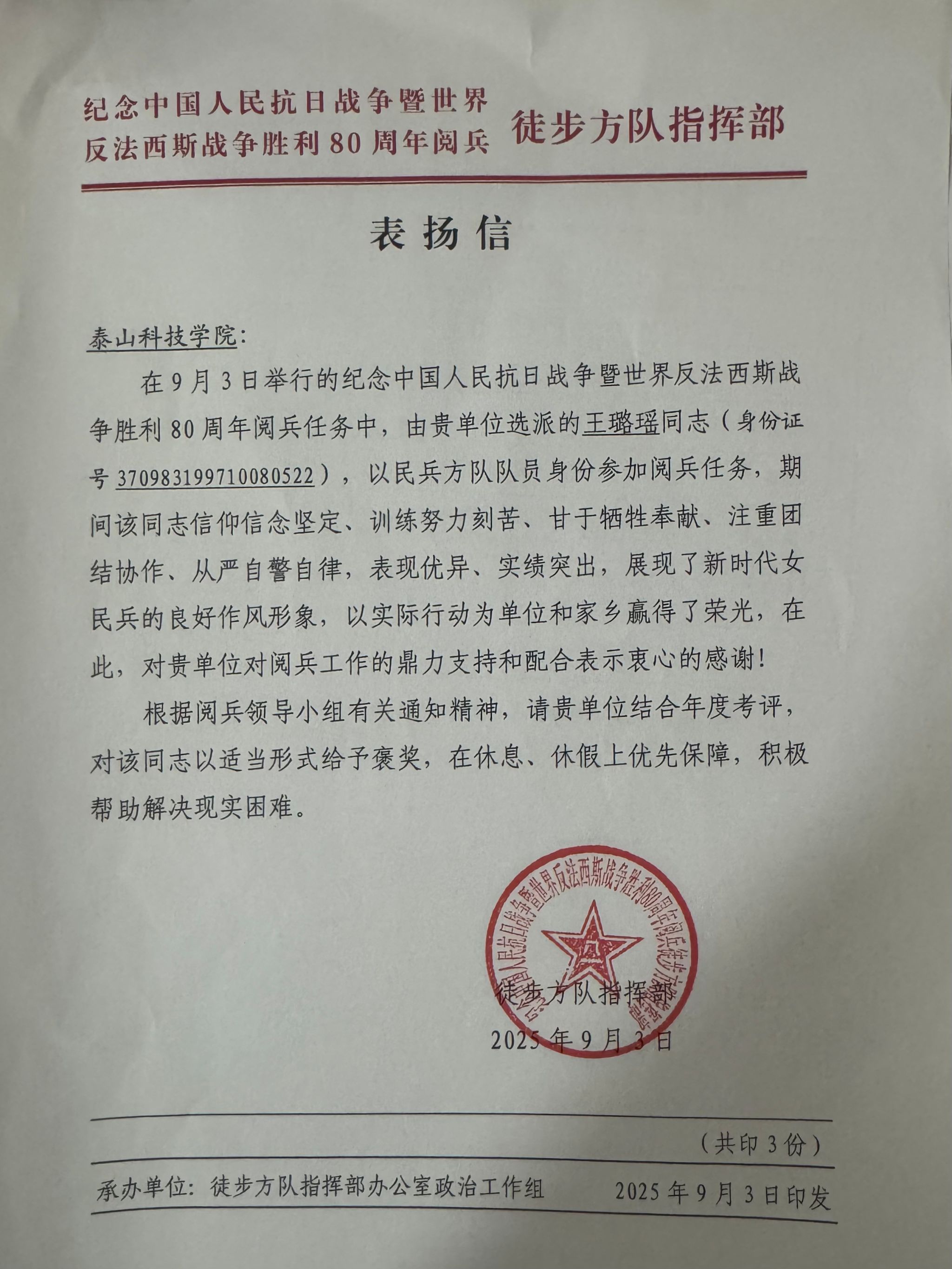 徒步方队指挥部在感谢信中特别指出,王璐瑶老师在受阅训练期间,“信仰信念坚定、训练努力刻苦、敢于牺牲奉献、注重团结协作、从严自警自律,表现优异、实绩突出,展现了新时代女民兵的良好作风形象,以实际行动为单位和家乡赢得了荣光。”她的优异表现,为整个方队的成功奠定了坚实基础,并对泰山科技学院“对阅兵工作的鼎力支持和配合表示衷心的感谢”。