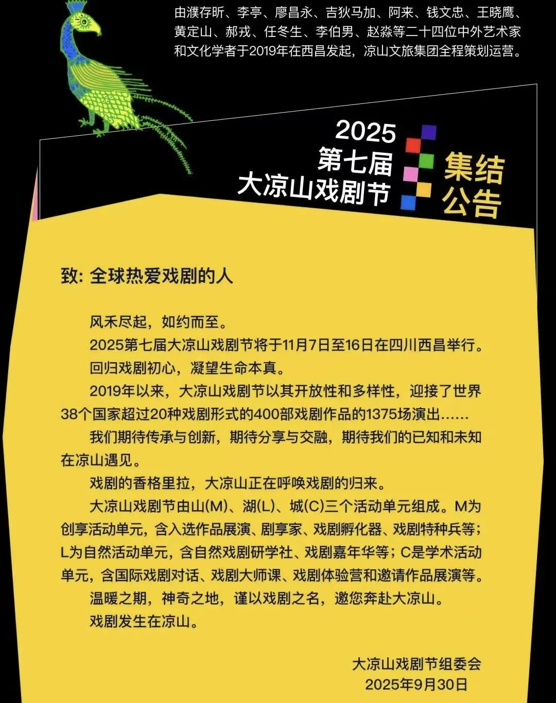 中国大凉山国际戏剧节自2019年由濮存昕、李亭、廖昌永、吉狄马加、阿来、王晓鹰、郝戎、任冬生、李伯男等二十四位中外艺术家与文化学者共同发起以来,始终秉持“回归戏剧初心、凝望生命本真”的宗旨。迄今已汇聚全球38个国家、超过20种戏剧形式的400部作品,累计演出1375场。戏剧节以国际化视野搭建文化交流平台,推动不同文明互鉴融合,助力中国故事走向世界。